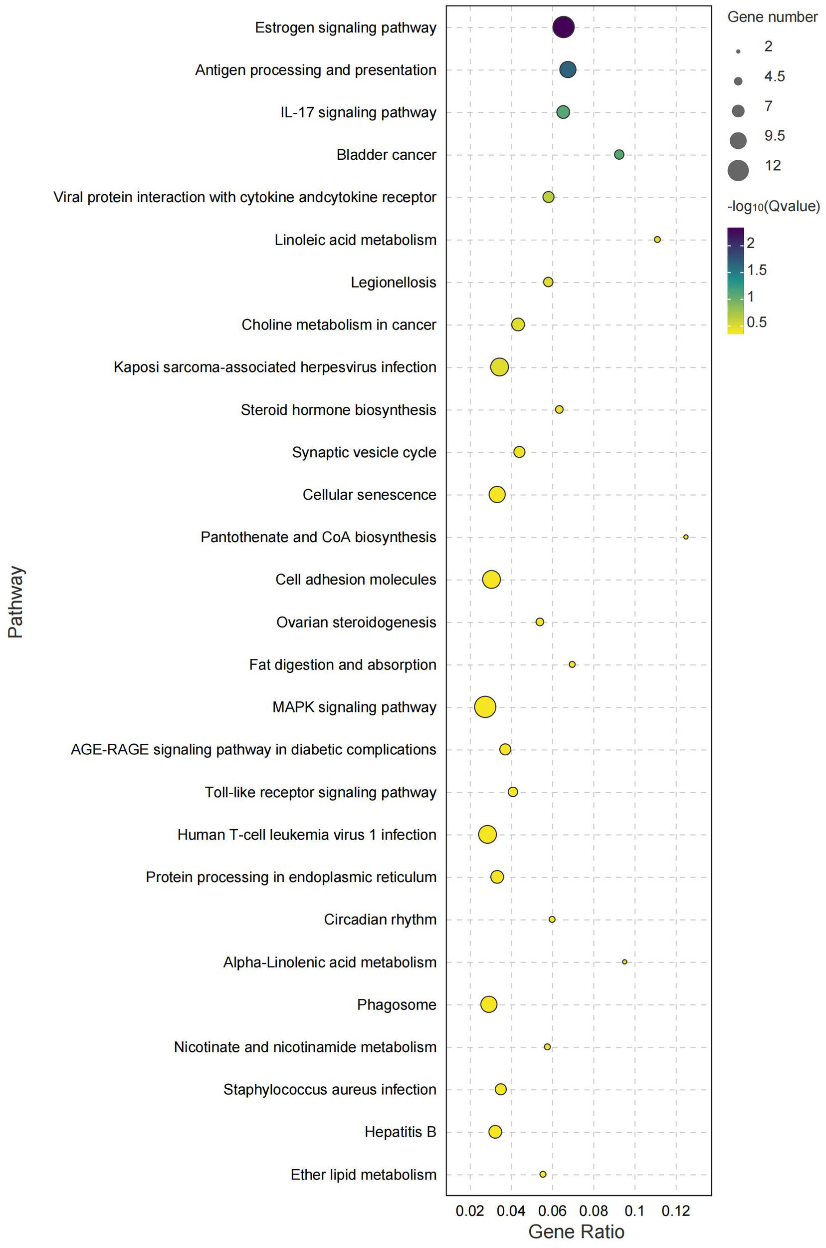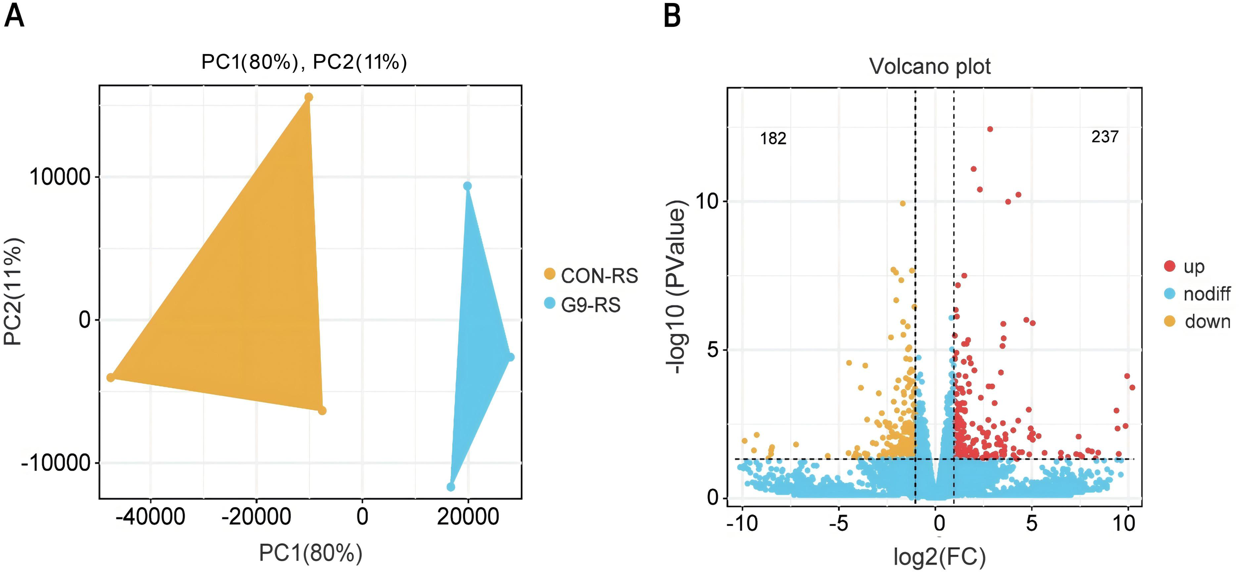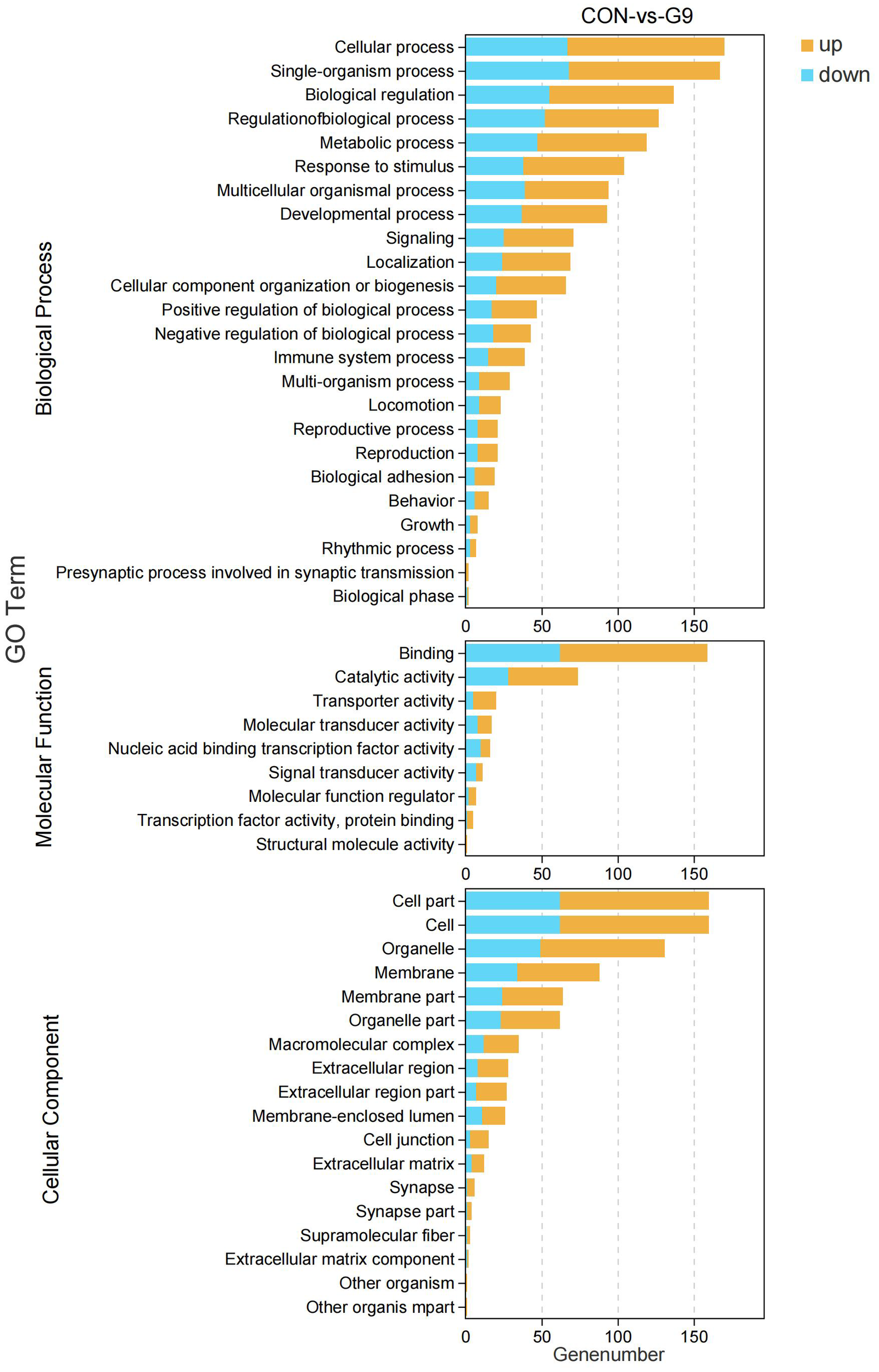 The String Tie software (version 2.2.0) was used to calculate the FPKM value. The R program DESeq2 (1.16.1) was utilized to determine the difference in genes between the G9 and control groups. DESeq2 uses a model based on the negative binomial distribution to provide statistical methods for identifying differential expression in digital gene expression data. The DEG threshold for significance was set to P < 0.05 and |log2FoldChange| ≥ 1. After performing GO and KEGG pathway enrichment analysis on DEGs, a statistically significant result was defined as P < 0.05.