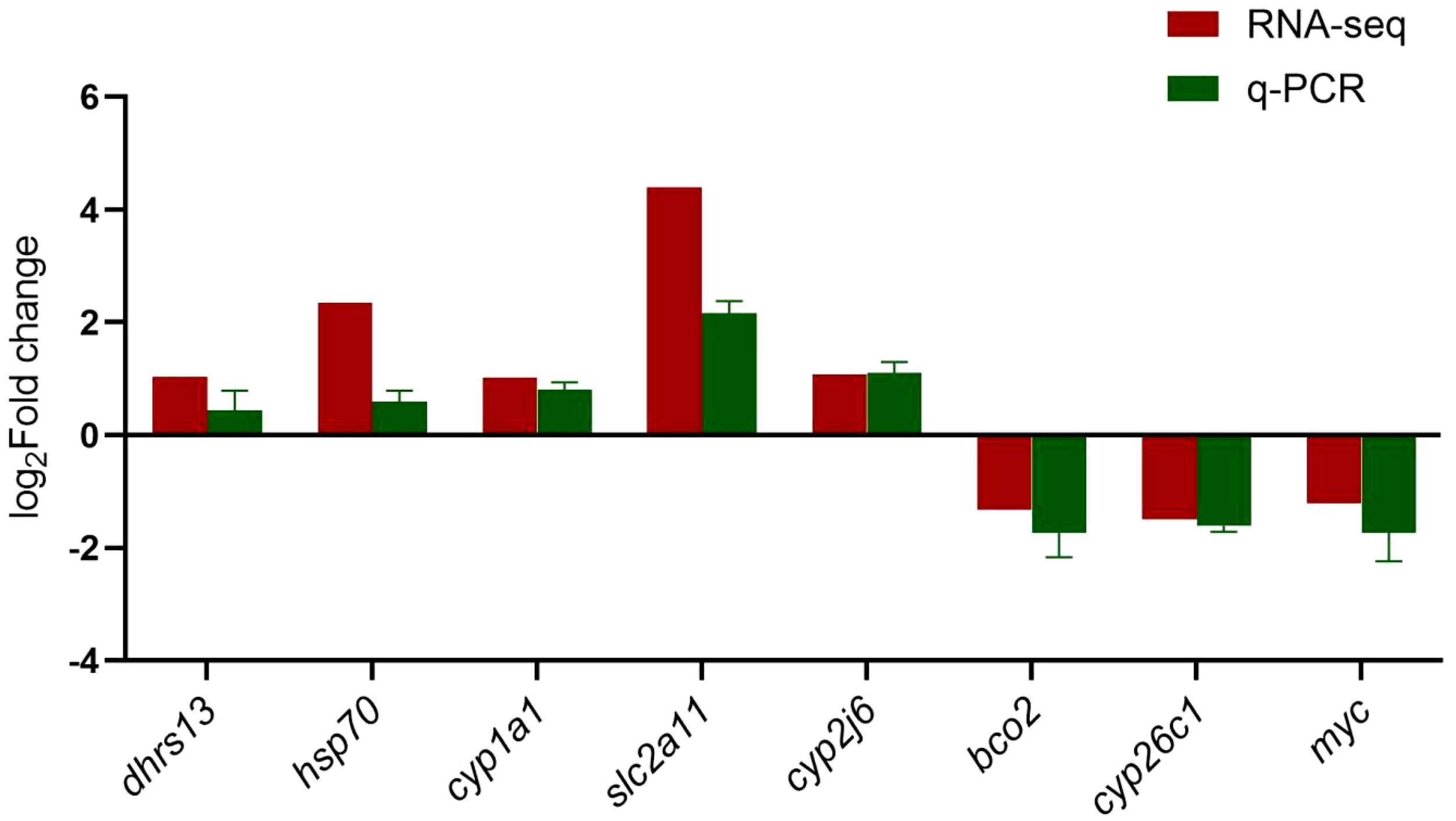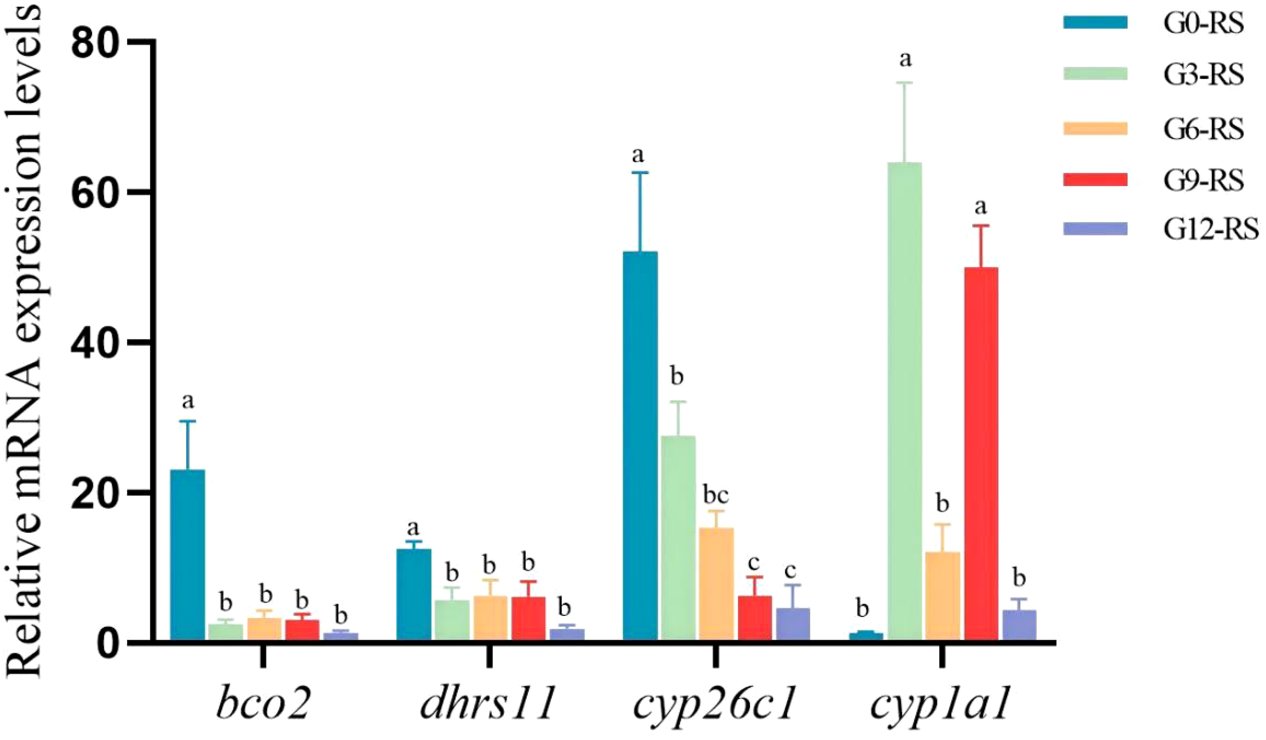For qRT-PCR analysis, eight DEGs (P < 0.05 and |log2FC| ≥ 1) involved in carotenoid metabolism and deposition, including cytochrome P450, family 2, subfamily j, polypeptide 6 (cyp2j6), cytochrome P450 family 1 subfamily A member 1 (cyp1a1), pigment cells development (heat shock protein 70 (hsp70), solute carrier family 2 member 11 (slc2a11)), carotenoids decomposition (9’,10’-β-carotene oxygenase (bco2)), retinoic acid metabolism (cytochrome P450 family 26 subfamily C member 1 (cyp26c1), dehydrogenase/reductase 13 (dhrs13)), and randomly selected gene (myelocytomatosis oncogene (myc)), were chosen to confirm the accuracy of the transcriptome data. In addition, the expression of four key genes, cyp1a1, slc2a11, bco2, and cyp26c1, was detected by qRT-PCR to further evaluate the effect of feeding Lianjiang red orange peels at different dosages on improving coloration. Primer 6.0 software was used to design primers. The primers used in this study are shown in Table 3. Reverse transcription was carried out to synthesize cDNA using TransScript® Uni All-in-One First-Strand cDNA Synthesis Super Mix (TransGen, Beijing, China). qRT-PCR was performed using PerfectStart® Green qRT-PCR SuperMix (TransGenTrans, Beijing, China) on the Roche LightCycler® 96 System (Roche Diagnostics, Basel, Switzerland). The qRT-PCR program consists of an initial denaturation at 94°C for 30 s, succeeded by 40 cycles of 94°C for 5 s, 59°C for 15 s, and 72°C for 10 s. Additionally, β-actin was used as a reference gene to normalize the expression values. Each group consisted of three biological replicates, and each sample in the qRT-PCR reaction was analyzed with three technical replicates. The relative gene expression levels were determined using the 2−ΔΔCt method. The mean values (m-values) of 2−ΔΔCt for each sample were calculated by averaging the three technical replicates. Subsequently, the mean for the m-values for gene expression levels of the three samples in G0 group was calculated to normalize the fold changes (FC). The FC values or each sample in the G9 group were then computed using the formula: FC = m-values of 2−ΔΔCt (for the G9 group)/Means of m-values (for the G0 groups), and then the Log2(FC) values were calculated. The data expressed as means ± standard error (SE) (n = 3). The graphical representation of the data was generated using GraphPad Prism 9.0 software (GraphPad Software Inc., San Diego, CA, USA).