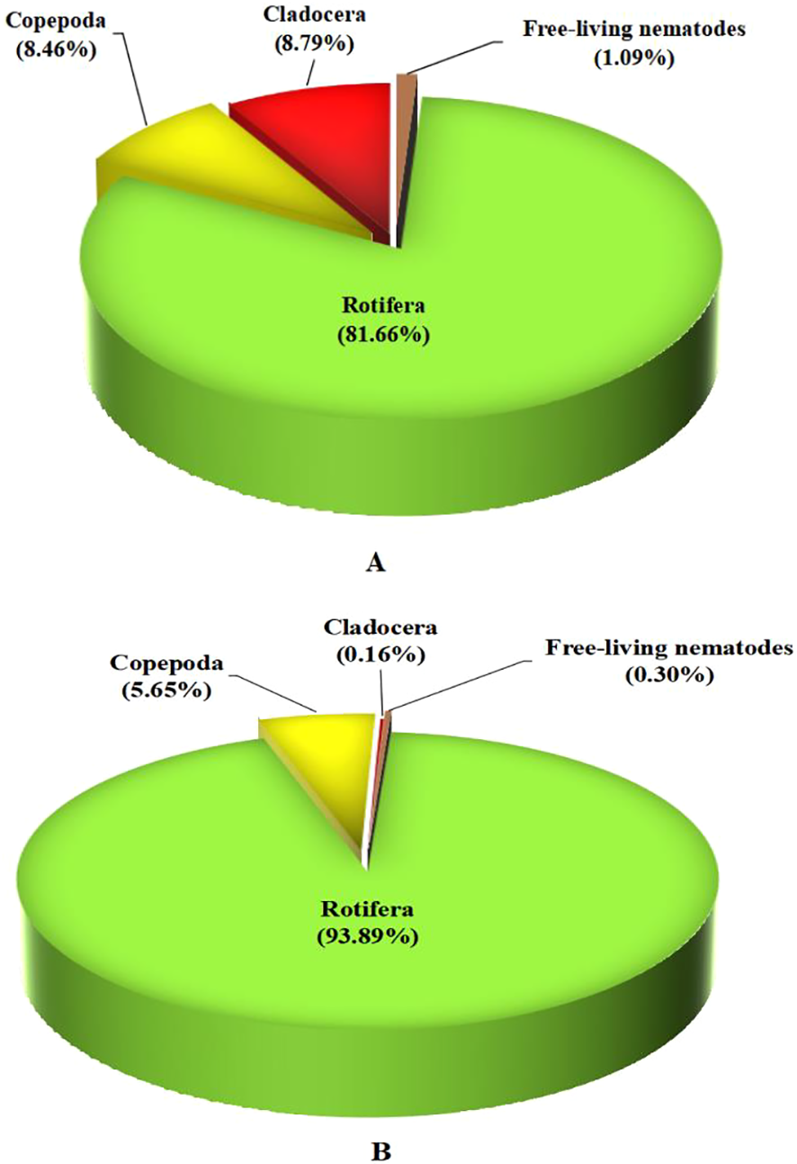 The present examination of zooplankton was identified and counted on D-0, D-30, and D-60 to investigate the effects of adding biofloc water supplementation on zooplankton (community, quantity, abundance, and structure) and to explore the aquaculture potential of these small invertebrates, in water culture, which will be grown to serve as prey for Nile tilapia during the experimental period under biofloc strategy. Figure 2 shows the standing crop of zooplankton (structure and community) on day 0 (D-0, the initial of the experiment), which is mainly Rotifera.
