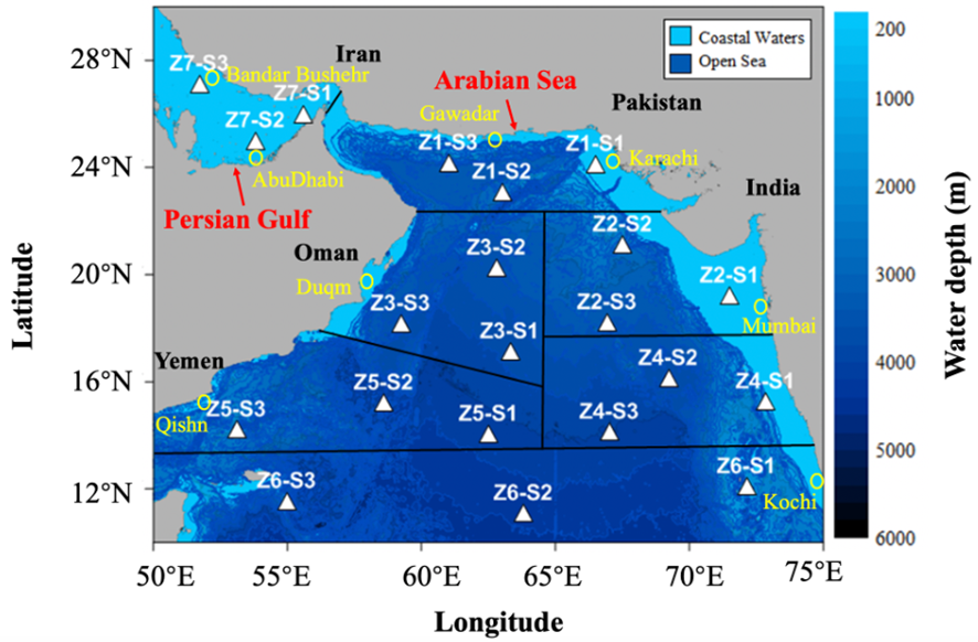 The study area was divided into seven zones, each containing three stations strategically positioned based on geographical and oceanographic significance (Figure 1). Zone 1, along the Pakistan coastline, is crucial for its upwelling, supporting rich fisheries in the northern AS. Zone 2, along the Indian coast, is influenced by monsoons driving nutrient inflow and boosting productivity. Zone 3, near Oman, is shaped by Arabian coastal currents, while Zone 4, along southern India, is affected by monsoon-driven currents impacting nutrient dynamics. Zone 5, off Yemen, benefits from upwelling, supporting marine biodiversity. Zone 6, in the equatorial region, experiences equatorial currents and upwelling influencing Chl-a variability. Zone 7, the PG, is notable for its unique hydrological conditions and proximity to oil-producing nations. This division enabled a region-specific analysis of the factors driving Chl-a dynamics, offering insights into how geographic and climatic factors influence marine productivity across the ASPG.