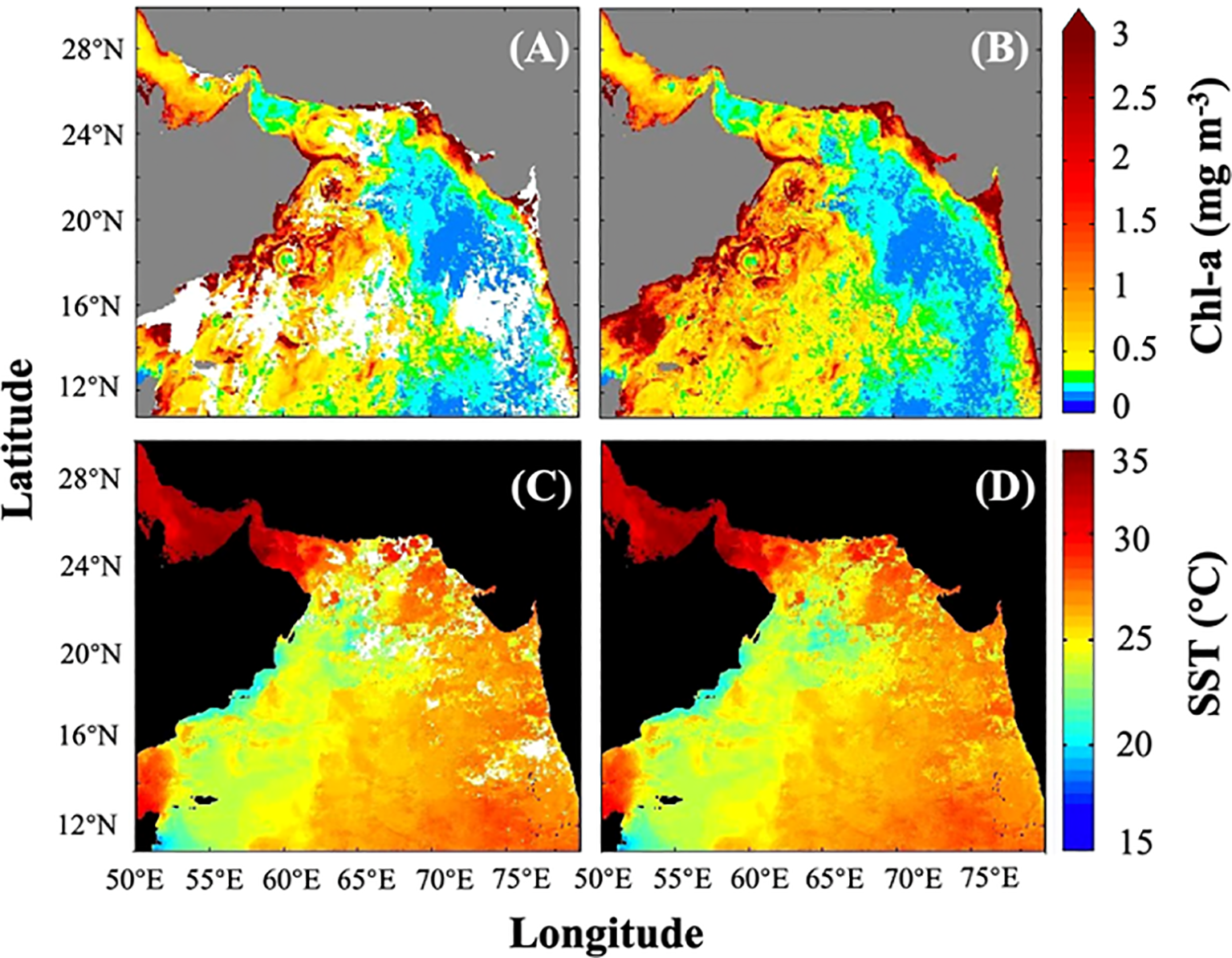 Previous research in these areas has revealed distinct seasonal and interannual patterns in Chl-a variability, which are often associated with factors such as sea surface temperatures (SST), monsoonal winds, upwelling events, and large-scale climate phenomena like the Indian Ocean Dipole and El Niño (Jayaram et al., 2018; Nezlin et al., 2007; Sarma et al., 2012; Seelanki et al., 2022). Furthermore, some studies have reported trends in Chl-a that either increase or decrease over different time periods, typically related to changes in SST, monsoonal winds, and sea level anomalies (Prakash et al., 2012; Goes et al., 2005; Prasanna Kumar et al., 2010). However, many of these studies in the ASPG region have been limited by their relatively short time frames or their focus on specific regional areas, which may restrict the generalizability of their findings. Expanding research to cover longer time periods and broader regions could provide a more comprehensive understanding of Chl-a variability and its underlying drivers. Additionally, it has been observed that satellite-derived products in the ASPG are often affected by suboptimal conditions, such as sun-glint and cloud cover. These factors can lead to gaps in the satellite-derived geographical data, which may result in incomplete information for subsequent analyses.