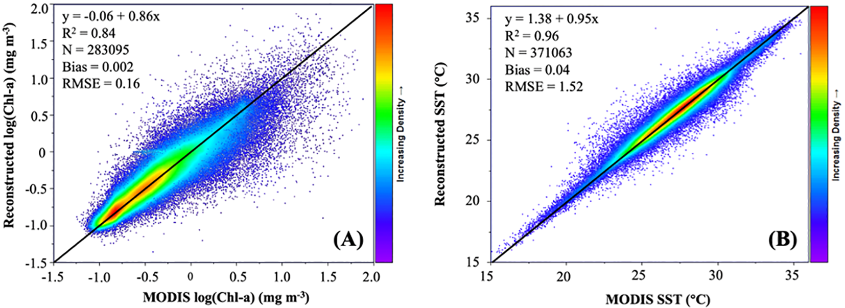Density plots: (A) log(Chl-a) (reconstructed) vs Chl-a (original) and (B) SST (reconstructed) vs SST (original). The black solid lines are the 1:1 line.