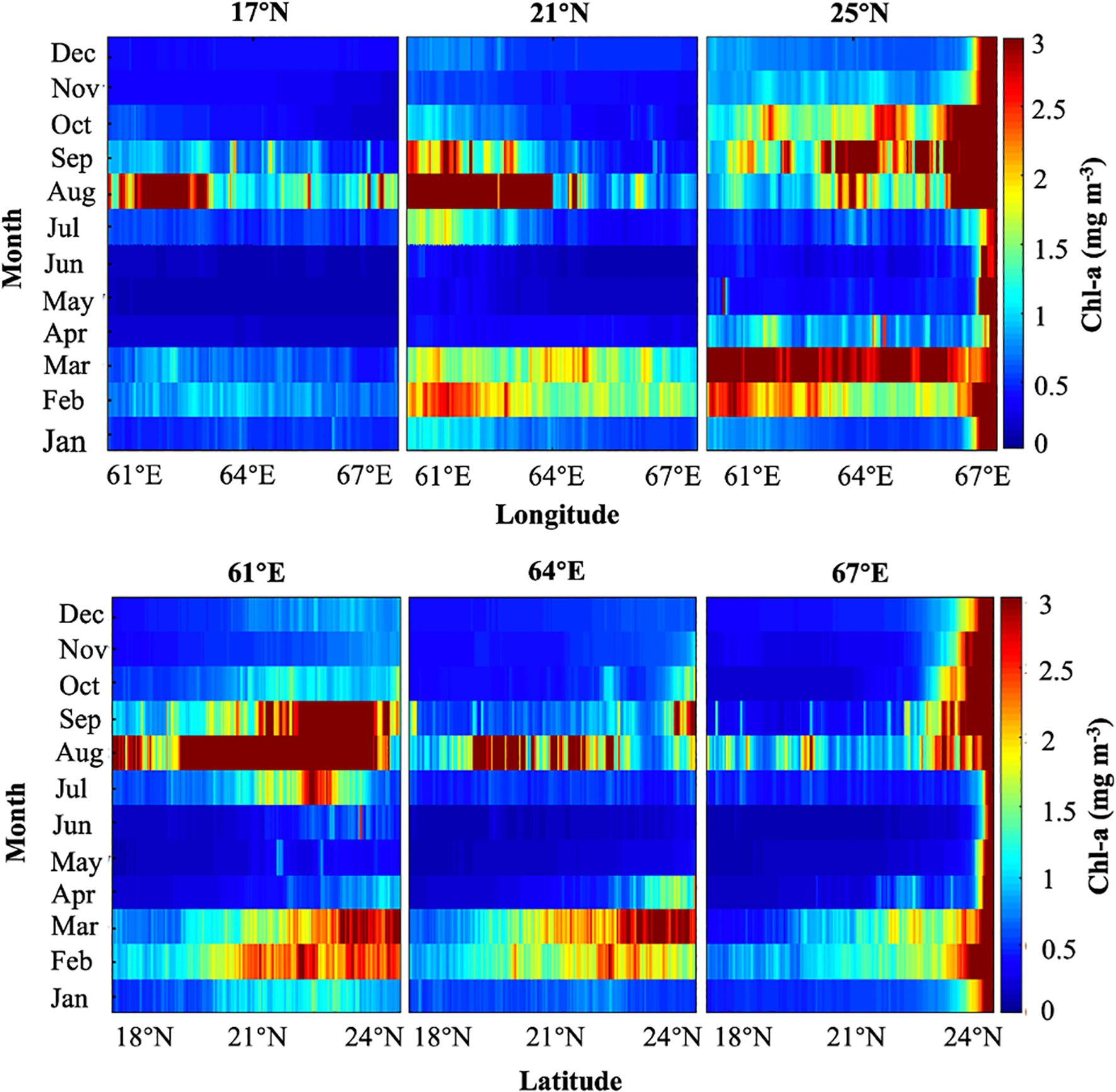 A Hovmöller diagram illustrating the monthly variability of reconstructed MODIS Chl-a from January to December at 17°N, 21°N, and 25°N, as well as at 61°E, 64°E, and 67°E.