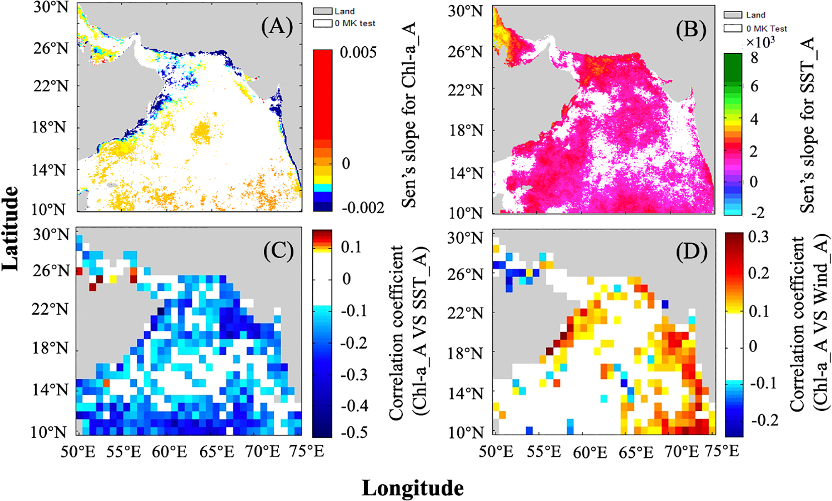 To analyze long-term trends in Chl-a and SST, the interannual monthly anomaly data were used to compute Sen’s slope for each pixel, where positive and negative values indicate increasing and decreasing trends, respectively, and a value of zero denotes no trend. The statistical significance of Sen’s slope was assessed using the Mann-Kendall (MK) test, with results coded as 1 for significant trends and 0 for non-significant trends. Non-significant Sen’s slope values were masked, indicated by white areas. The spatial distributions of Sen’s slope, along with the MK test results for Chl-a_A and SST_A, are illustrated in Figures 5A, B, respectively.