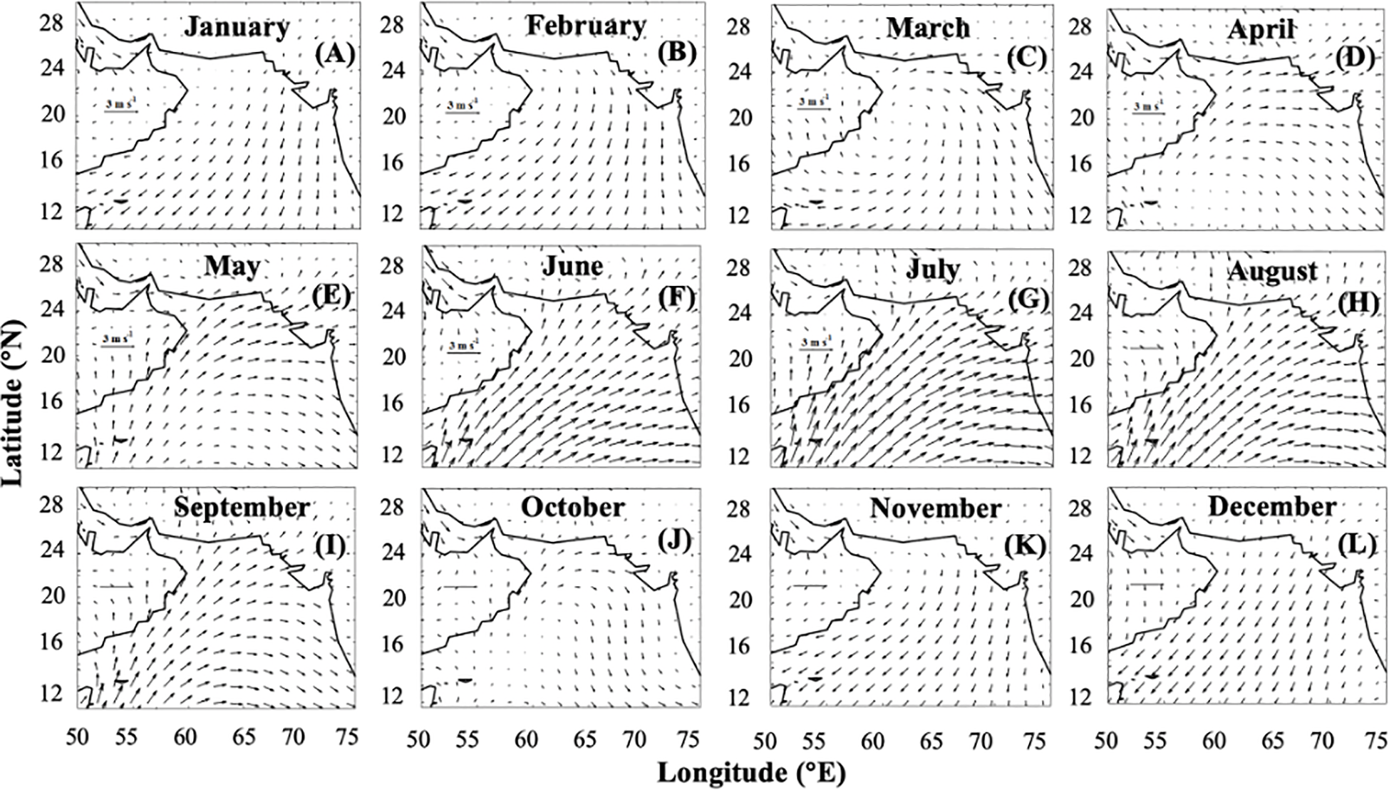 Monthly climatology of wind vectors over the ASPG from January to December (A–L). Vectors in all panels have the same scaling to allow for direct comparison of wind intensity across different months. Quantitative values of wind speeds are also provided for reference.