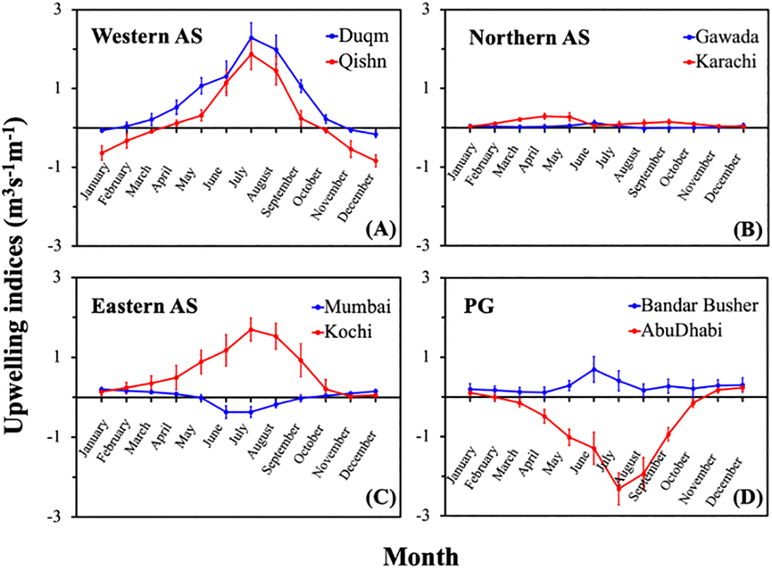 To further investigate upwelling dynamics, an upwelling index was calculated using wind vectors at eight coastal stations (Figure 1). These coastal stations were strategically selected for their proximity to known upwelling regions, such as Kochi, Duqm, and Qishn, which are significantly influenced by seasonal monsoonal winds. Additional stations were chosen based on their alignment with nearshore data points within each zone to ensure comprehensive coverage. Spanning a wide latitudinal range across the ASPG, these stations provide a thorough spatial representation of upwelling zones. This selection forms a robust foundation for analyzing upwelling dynamics and their influence on regional Chl-a variability.