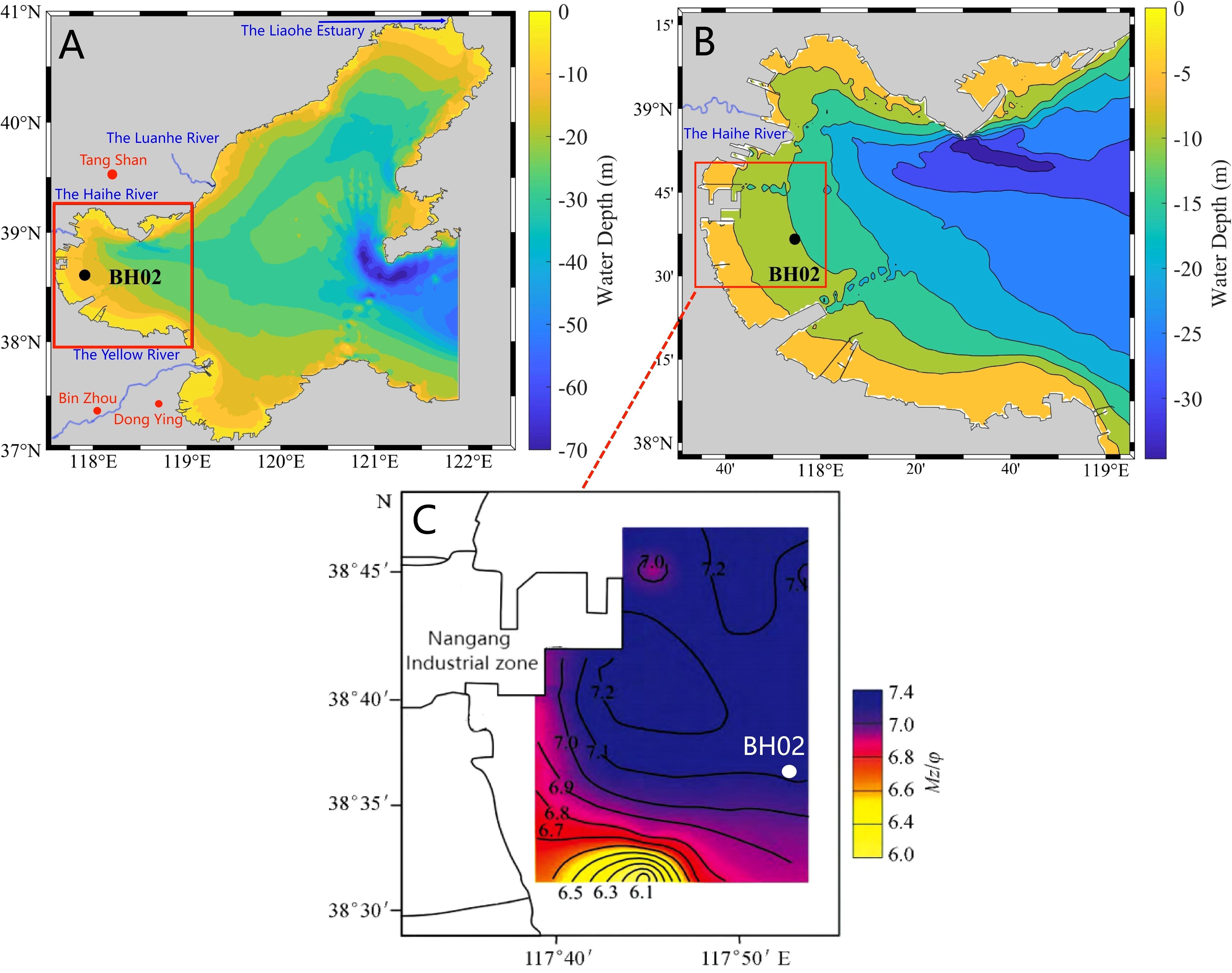 Figure 1. Location of the study area. (A) Bathymetric chart of the Bohai Sea; The area labeled ‘b’ is outlined by the red line. Red dots indicate cities while blue lines indicate the primary rivers flowing into the Bohai Sea. (B) Bathymetric chart of Bohai Bay. Black dot indicates station BH02. (C) Distribution of sediment grain sizes in western Bohai Bay (Pan et al., 2018).