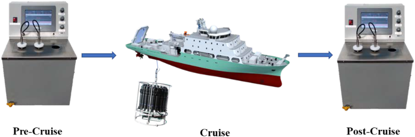 For instance, Sea-Bird Scientific provides a drift correction method to address data deviations in CTD instruments during long-term usage. This correction method does not rely solely on single field data but combines laboratory calibration results with pre- and post-cruise drift information. Specifically, users can calculate drift correction coefficients based on pre- and post-cruise calibration data to ensure the accuracy of conductivity, temperature, and pressure measurements throughout the cruise (Sea-Bird Electronics, Inc, 2016). The correction method involves calibrating the temperature sensor using a thermal bath before and after the deployment, calculating the temperature difference (residual) between the pre- and post-deployment calibrations, and then adjusting the temperature readings based on the number of days. The specific steps are as follows: first, calculate the residual (instrument temperature minus thermal bath temperature); then use the Equation, Offset = b * (residual/n), to correct the temperature data, where b is the number of days between the pre-deployment calibration and the measurement, n is the number of days between the pre- and post-deployment calibrations, and residual is the residual from the calibration table. The calibration schematic is shown in Figure 1 below.