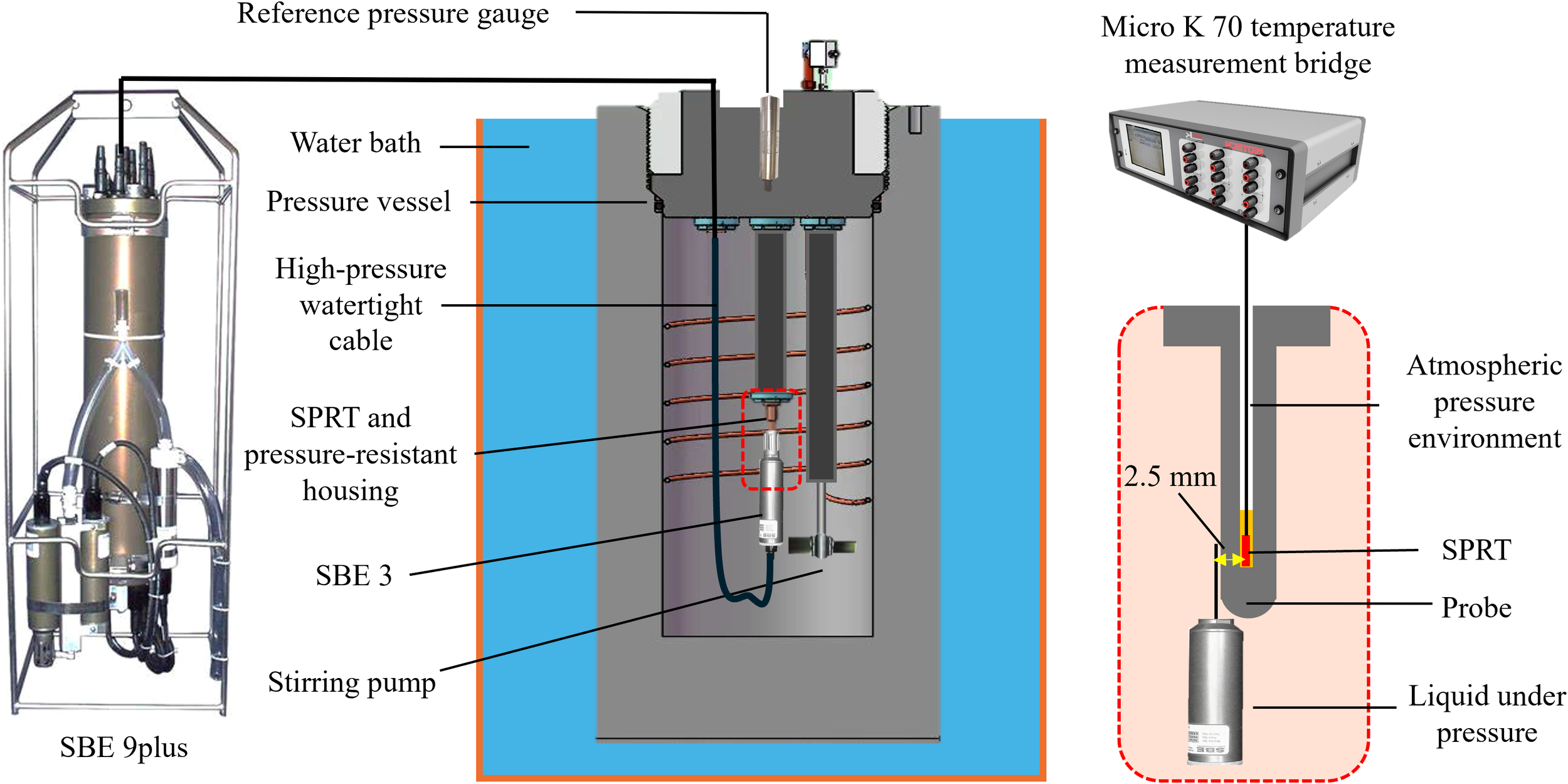 The red dashed box provides a detailed view of the placement of the SBE 3 probe and the pressure-resistant encapsulated SPRT. The SPRT is immersed in thermally conductive silicone oil within the pressure-resistant housing. The design principle of the housing ensures that, even under slight deformation, its inner diameter remains larger than the SPRT, thus fully shielding the SPRT from the simulated chamber pressure. The thermally conductive silicone oil inside the housing is vented to atmospheric pressure through a sufficiently long capillary. This allows the silicone oil to flow slightly when the housing is compressed, preventing stress transmission to the SPRT, which could otherwise occur in closed solid thermal structures. To minimize external temperature effects, the SPRT is positioned at the center of the pressure chamber through the pressure-resistant adapter and is connected to the MicroK 70 temperature measurement bridge via four equidistant copper wires. The SBE 3 is in close contact with the encapsulated housing, ensuring that both measure the same temperature point.