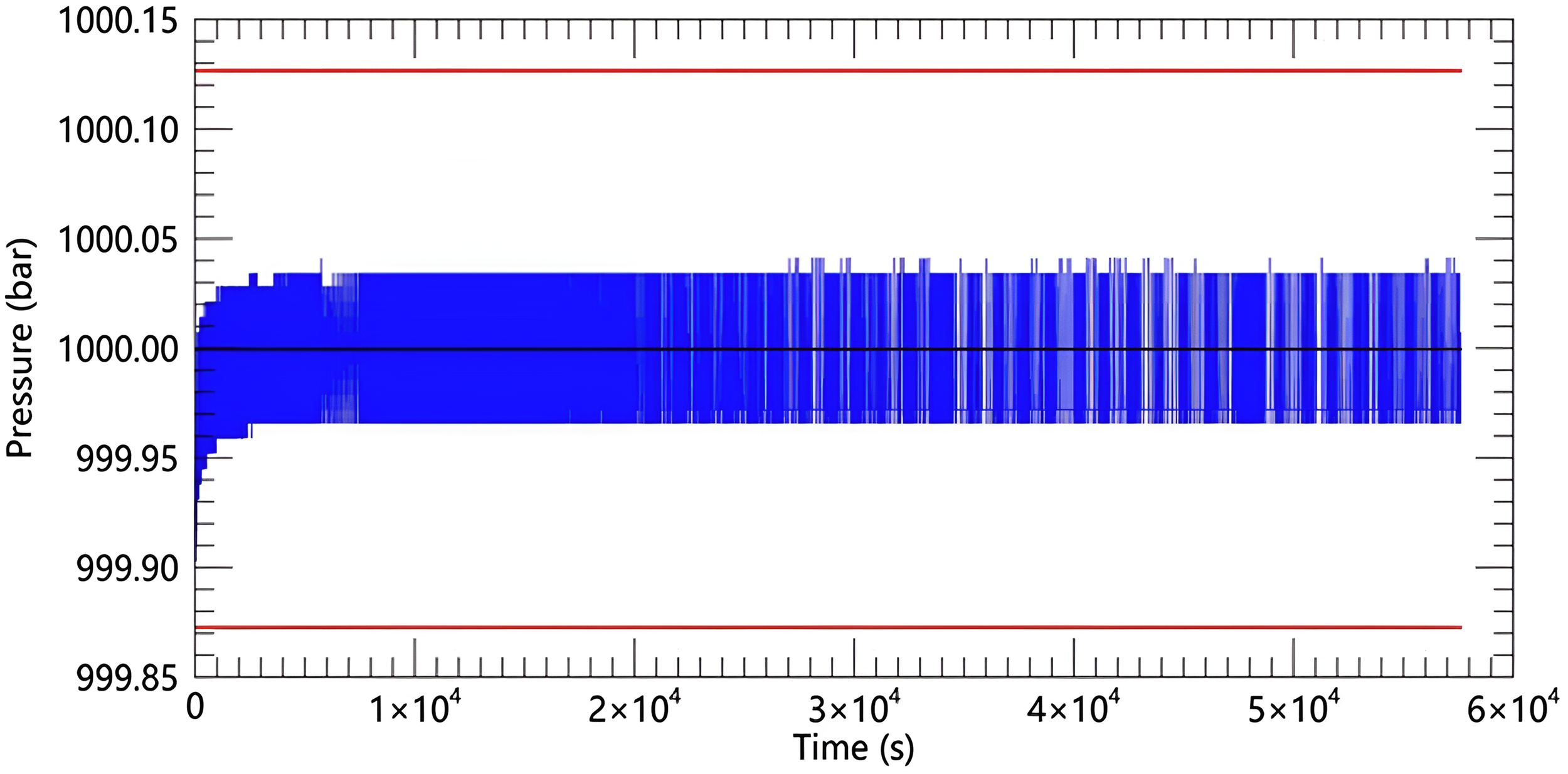 Pressure curve at 1000 bar for 16 hours (blue line). The black line is the pressure setting value, and the red line is the setting value ±0.127 bar(± 0.01%FS).