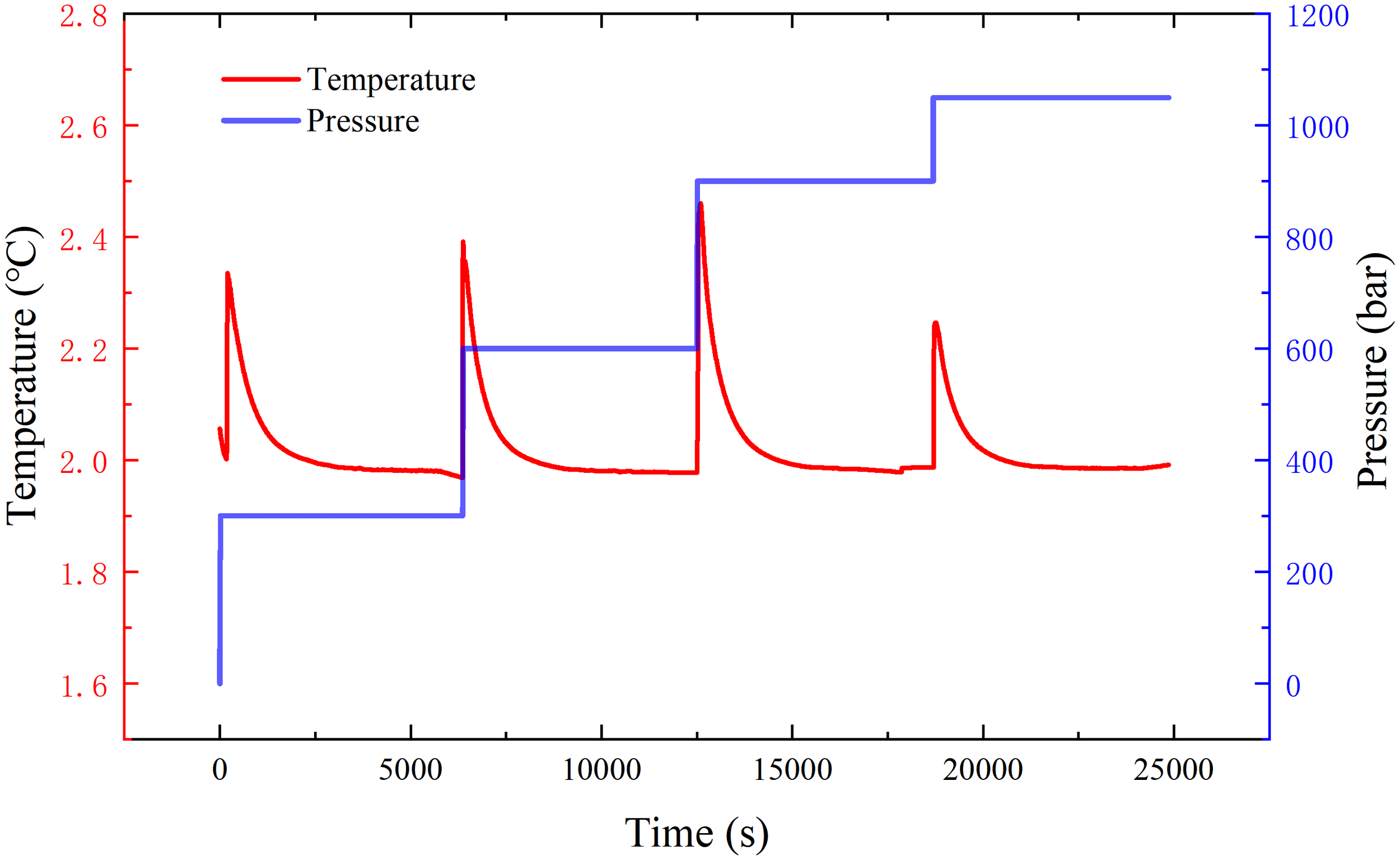 Figure 6 illustrates the variation of temperature and pressure over time during the test. The red curve represents temperature (left vertical axis, in °C), and the blue stepped curve represents pressure (right vertical axis, in bar). The figure shows that while the pressure increases, there is a brief rise in temperature, which quickly returns to the stable state prior to the pressure increase. This indicates that although the increase in pressure temporarily affects the temperature, the system can quickly restore temperature stability. This record demonstrates the system’s capability to rapidly stabilize temperature, ensuring that the temperature rise effect caused by increased pressure does not persist.