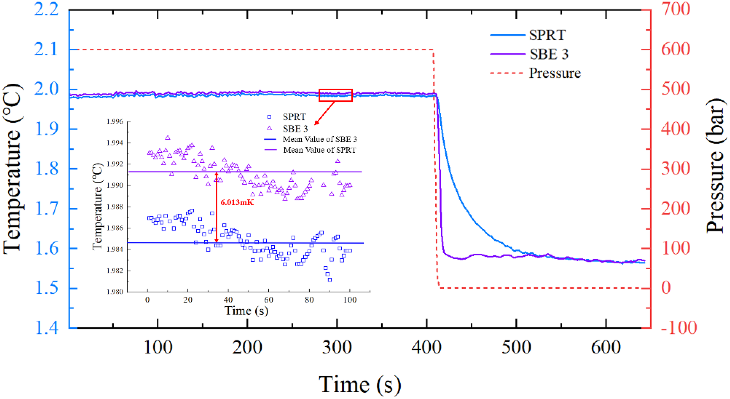 Graph of the change in temperature reading differences during the pressure drop process: This graph shows the temperature readings of the SBE 3 (purple line) and SPRT (blue line) thermometers during a pressure drop, with pressure (red dashed line) decreasing from 500 bar to near atmospheric levels. The inset zooms in on a specific time period, illustrating a temperature difference of 6 mK between the SPRT and SBE 3 readings.
