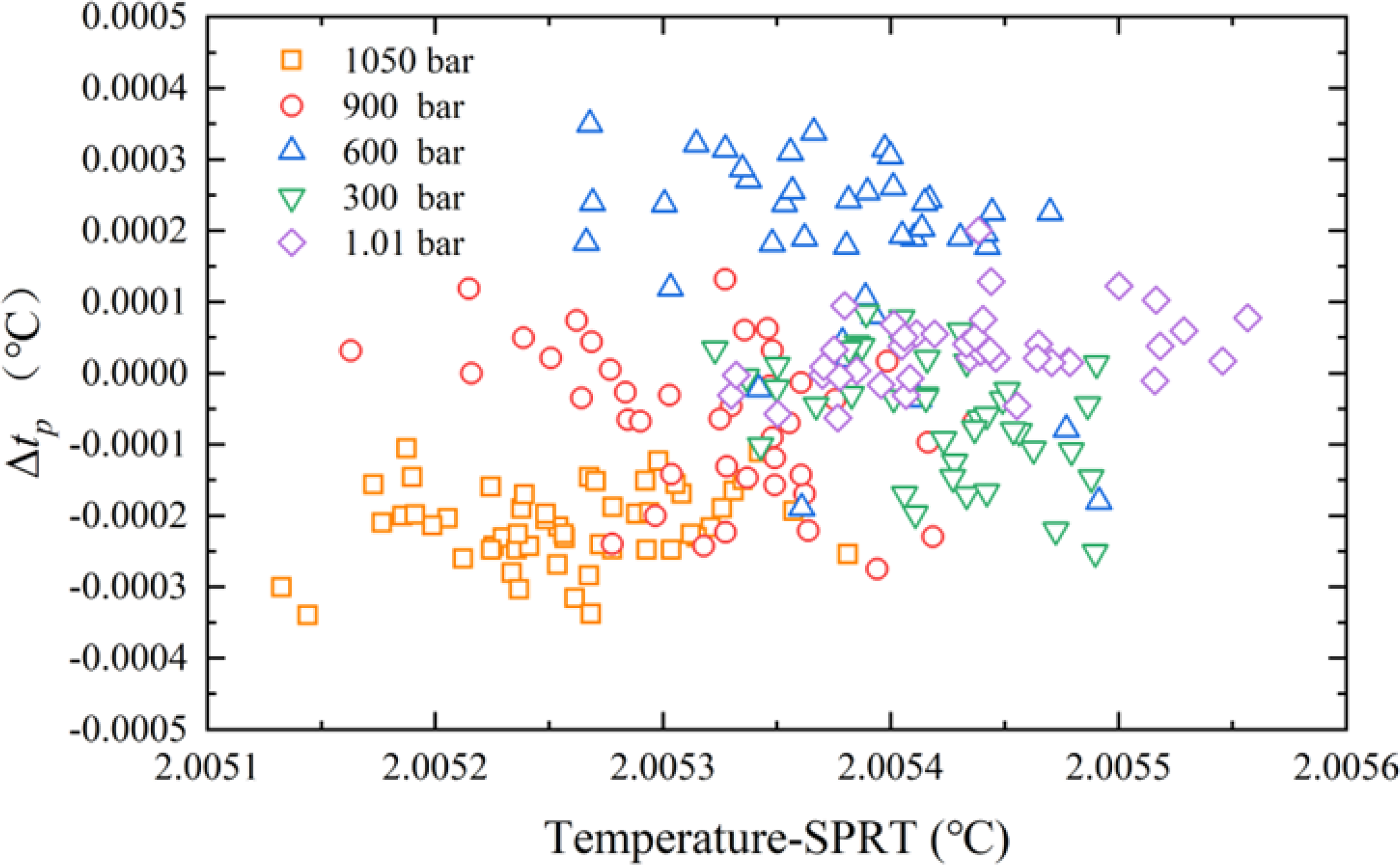 As shown in Table 1, the standard deviation of the environmental pressure , the standard deviation of the SPRT readings , and the standard deviation of the temperature differences between the two thermometers at various pressures were calculated for each test. The experimental data indicate that across a range of pressures from atmospheric pressure to 1050 bar, the standard deviations , and remained at low levels. In the three independent tests, the low values of demonstrate the high stability of the environmental temperature during measurements. The low values of indicate excellent temperature coordination between the SPRT and the thermometer under test, affirming the rigor of the pressure comparison experiments described in this study. Furthermore, the test results show that the temperature control in the experimental environment is highly accurate even under different pressure conditions, ensuring high data reliability. The stability of pressure control was validated by the consistent data obtained at various pressure levels, further proving the precision and repeatability of the experimental method.