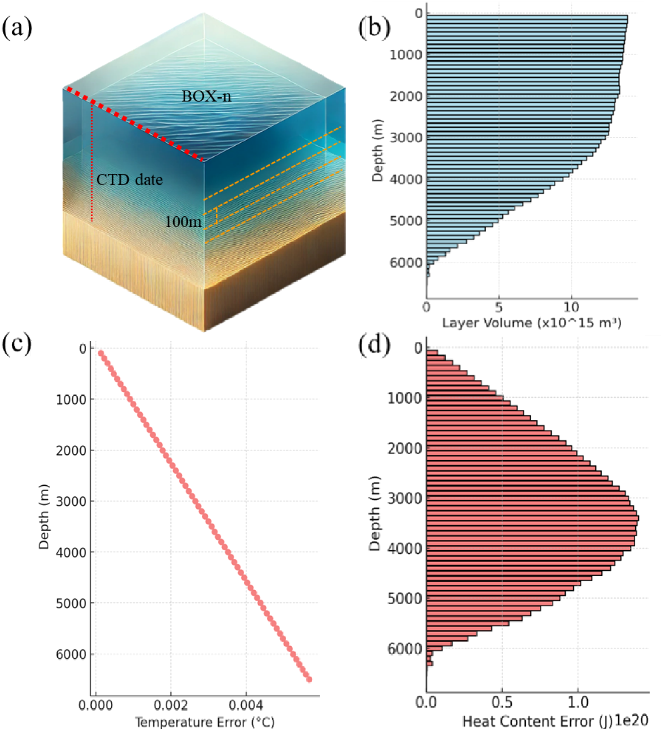 Impact of deep-sea thermometer errors on the assessment of Pacific Ocean heat content. (A) shows a three-dimensional view of the box model, illustrating the ocean divided into multiple vertical layers, each 100 meters thick; (B) depicts the volume of these layers decreasing with depth; (C, D) respectively show the distribution of temperature errors and heat content errors with depth.