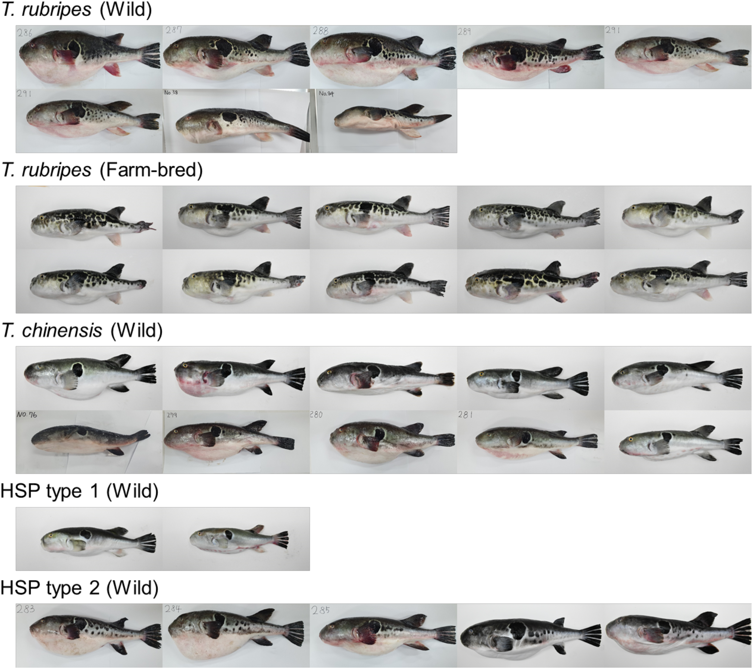 While genomic techniques are invaluable for identifying signs of domestication and pinpointing genes linked to local adaptation, more accessible genetic markers, such as microsatellites, remain crucial. These markers are effective in deciphering population structures, detecting genetic drift impacts, and assessing inbreeding within domesticated populations, especially when they show polymorphism (Prunier et al., 2023). In this study, we utilized a suite of 16 microsatellite markers to examine the genetic relationships among wild-caught T. rubripes, T. chinensis, and HSP from the waters around Jeju Island, alongside farm-bred T. rubripes from local aquaculture operations. Our analysis of genetic diversity and population structure aimed to (1) clarify the taxonomic distinctions between T. rubripes and T. chinensis, (2) provide genetic evidence of natural hybridization between these species, and (3) assess the genetic impacts of selective breeding on farmed T. rubripes populations. Our findings offer fresh insights into the evolutionary history and current genetic landscape of the T. rubripes-chinensis species complex, which hold significant implications for their taxonomy, conservation, and sustainable management.