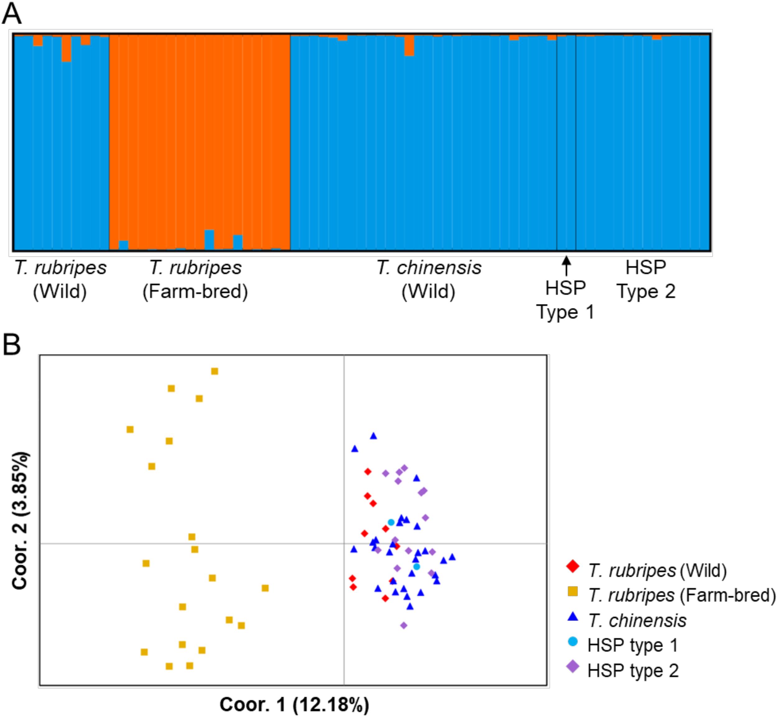 STRUCTURE plot (Best K = 2) of Takifugu rubripes-chinensis complex showing the proportion of genetic clusters (Q-values) on the Y-axis (A). PCoA plot of the T. rubripes-chinensis complex (B).