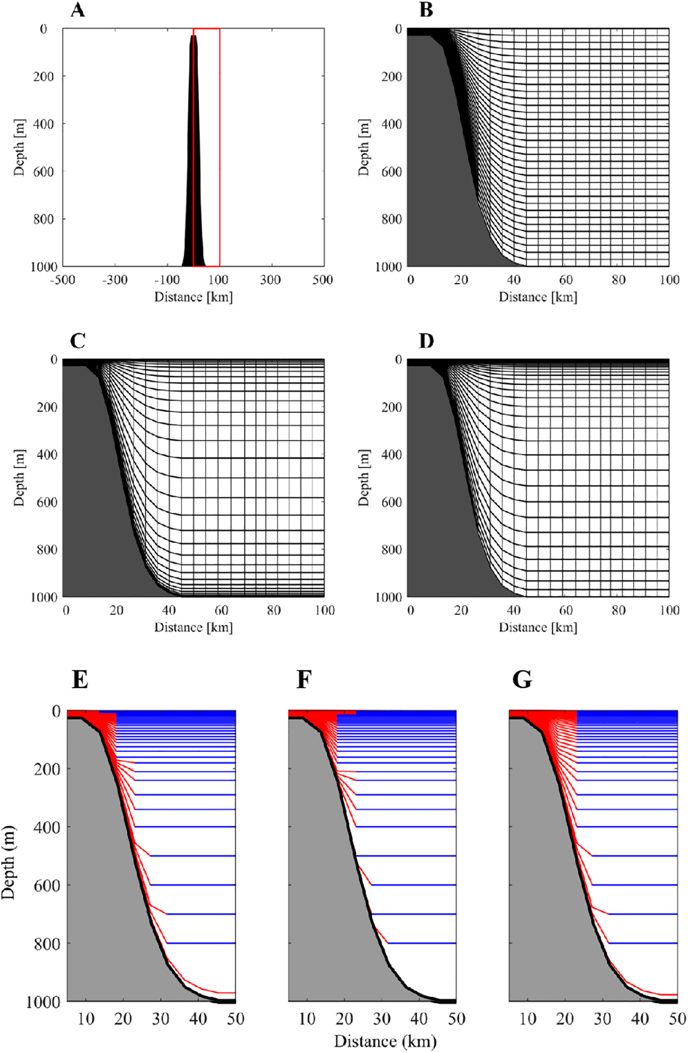 Schematic showing the topography (A) A1 coordinate (B) A2 coordinate (C) A3 coordinates (D) B1 coordinate (E) B2 coordinate (F) and B3 coordinate near a tall seamount. In the B1-B3 coordinate panels (E–G), red lines indicate conventional sigma layers, and the blue lines are z layers.