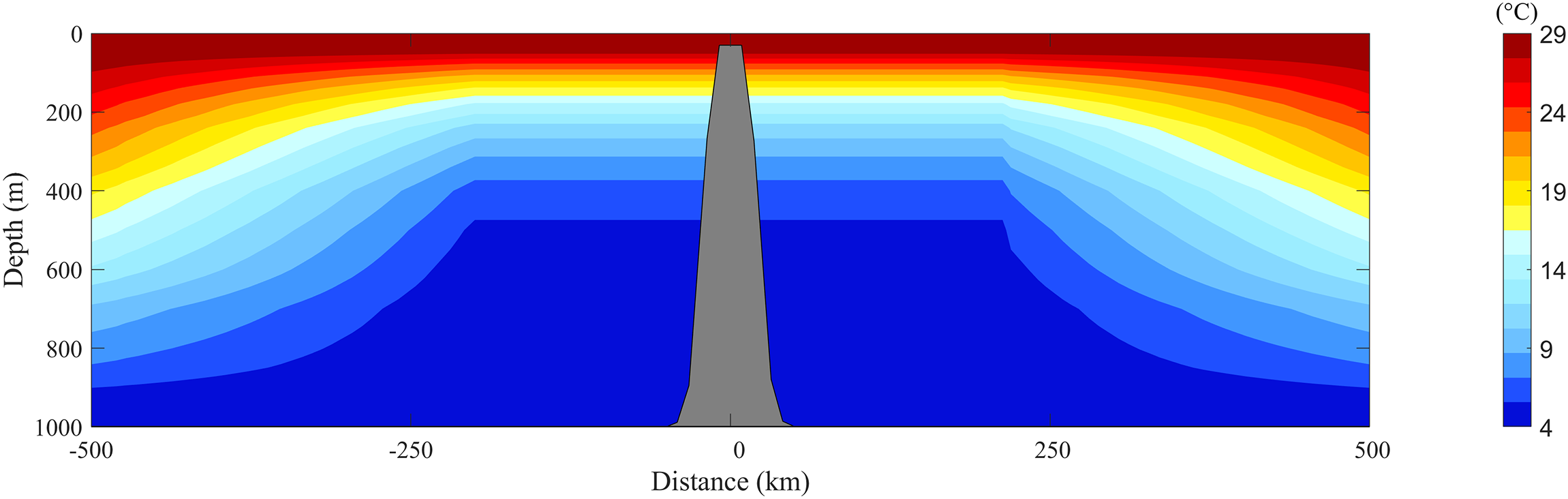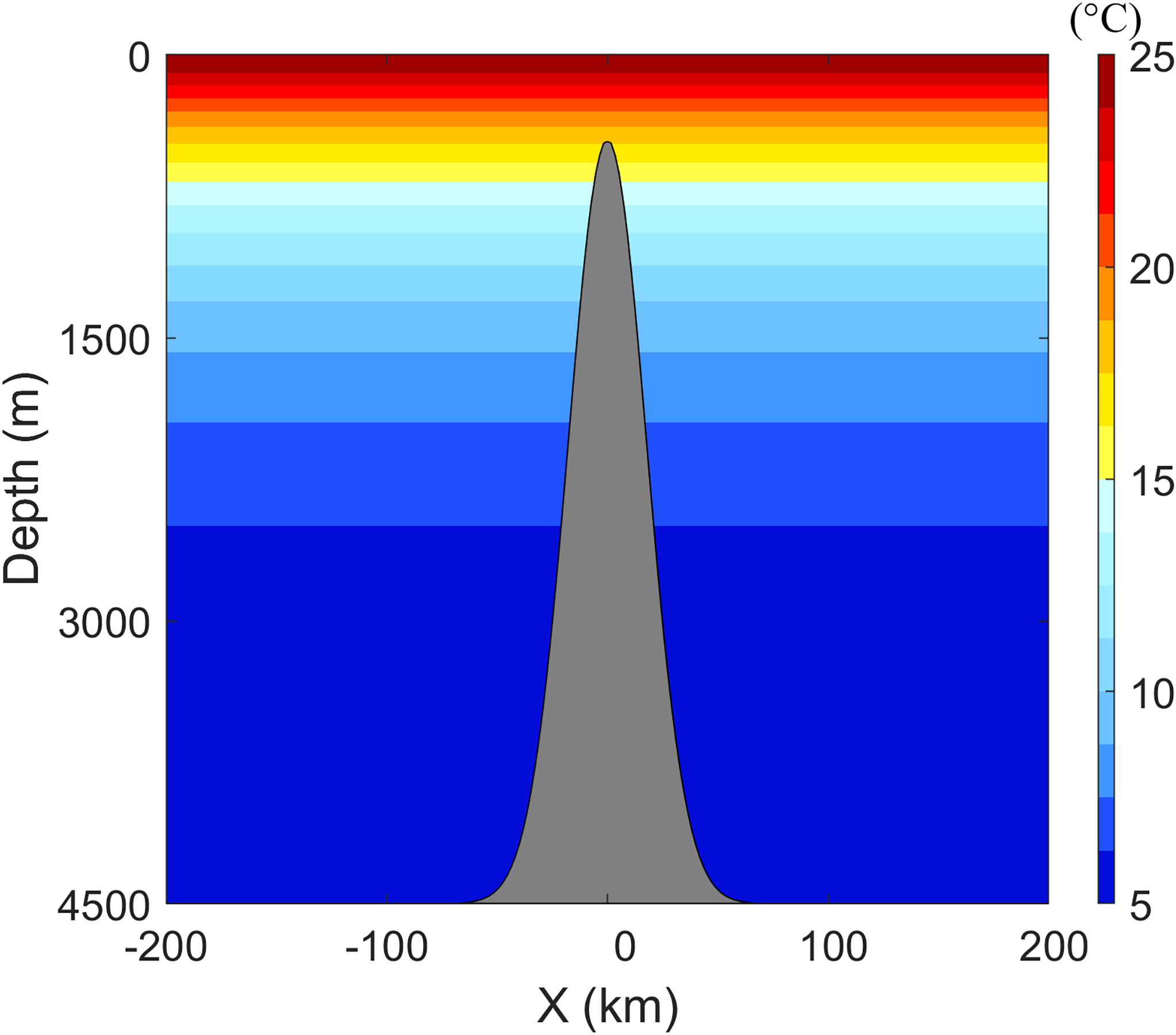 where =1000m, , and . is the distance to the center of the circular area. The maximum slope of the seamount is 5.6:100. Figure 7 also shows the temperature profile through the center. The temperature remains horizontally uniform near the seamount but varies with distance farther away. The temperature across the entire domain is defined by: