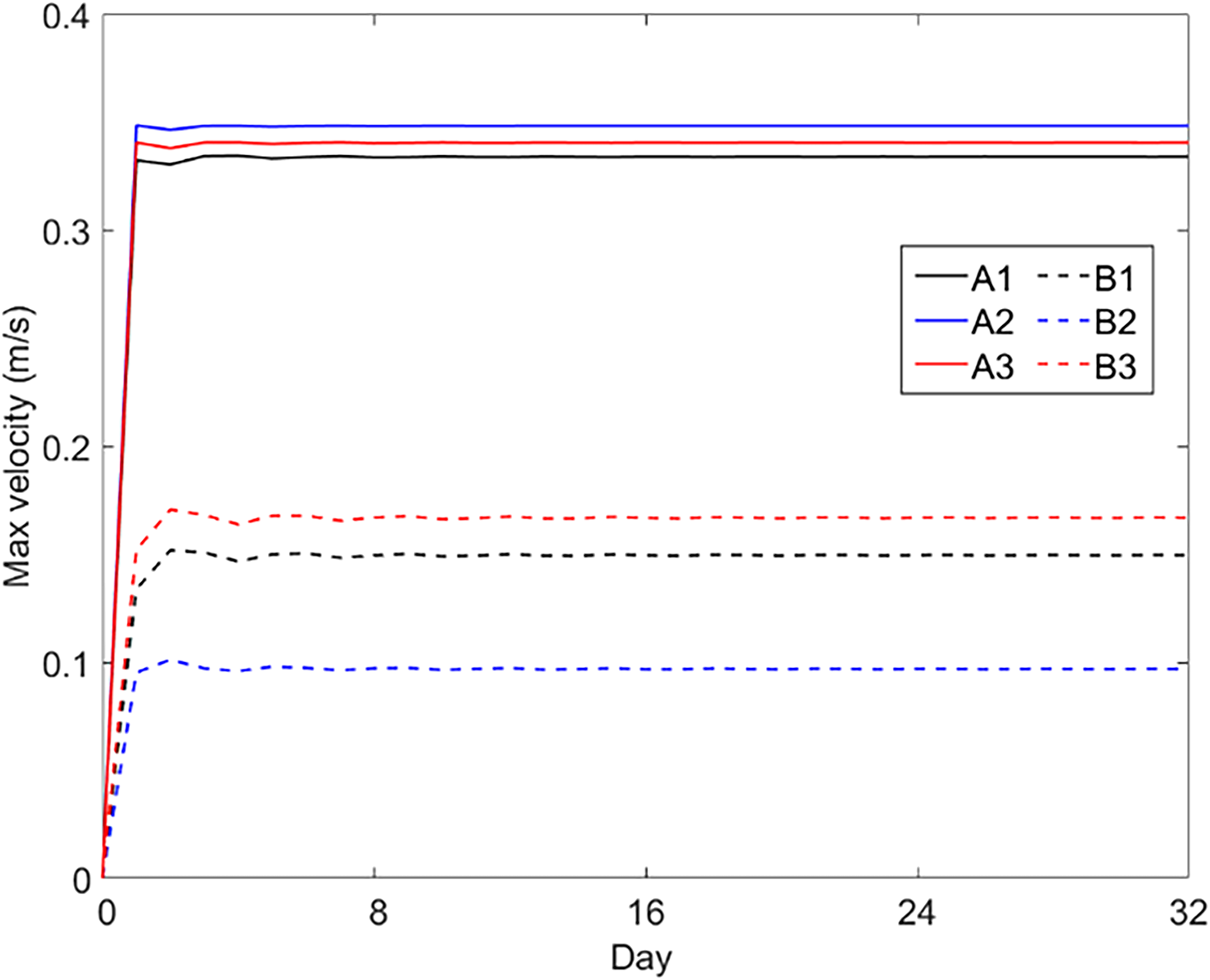 The maximum velocity in numerical experiments using different vertical coordinates. The A1, A2, A3, B1, B2, and B3 coordinates were applied in the experiments of CASEi01 to CASEi06.