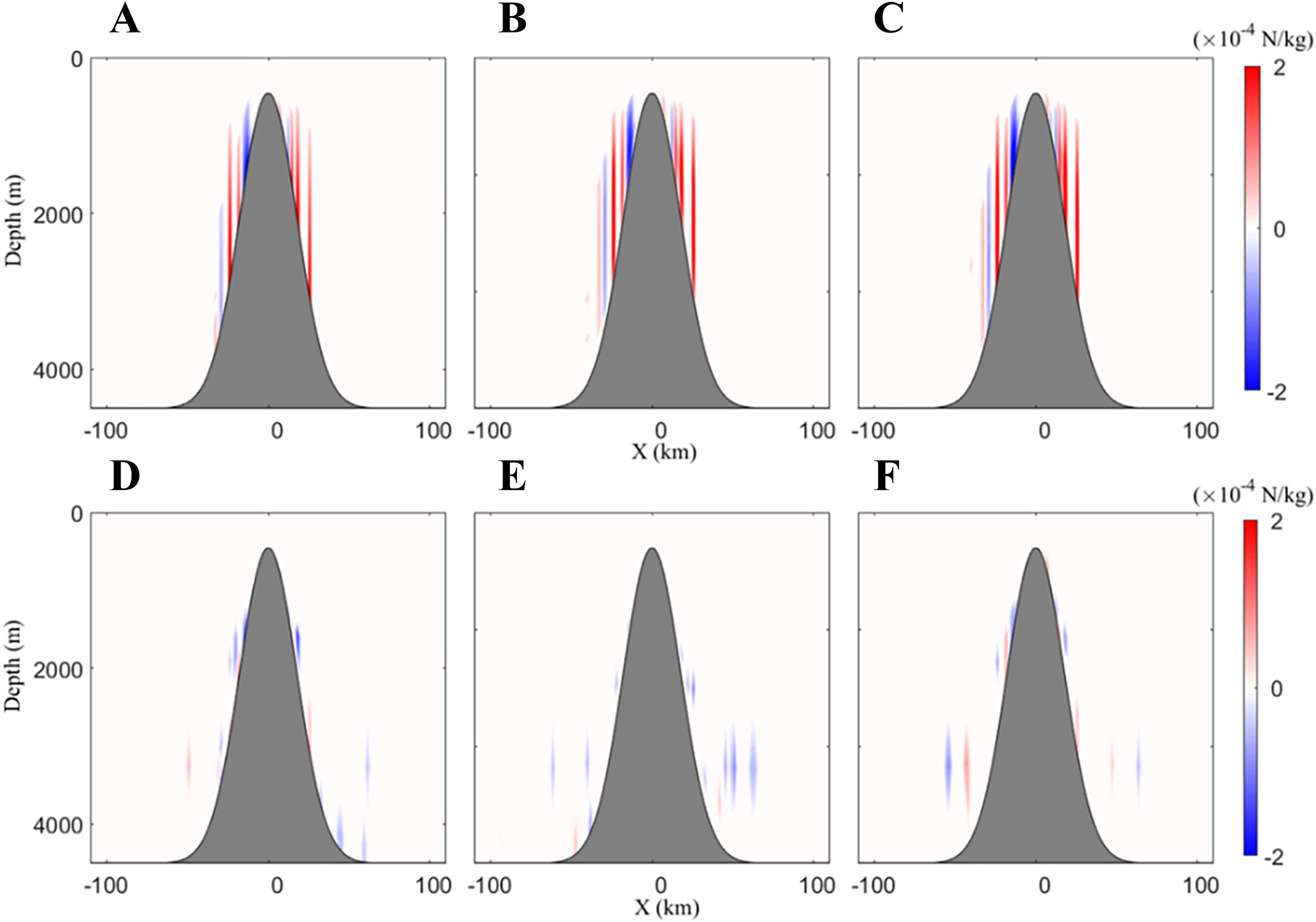Calculated BPGs along the east–west transect through the seamount in the experiments of (A) CASEi01, (B) CASEi02, (C) CASEi03, (D) CASEi04, (E) CASEi05 and (F) CASEi06.