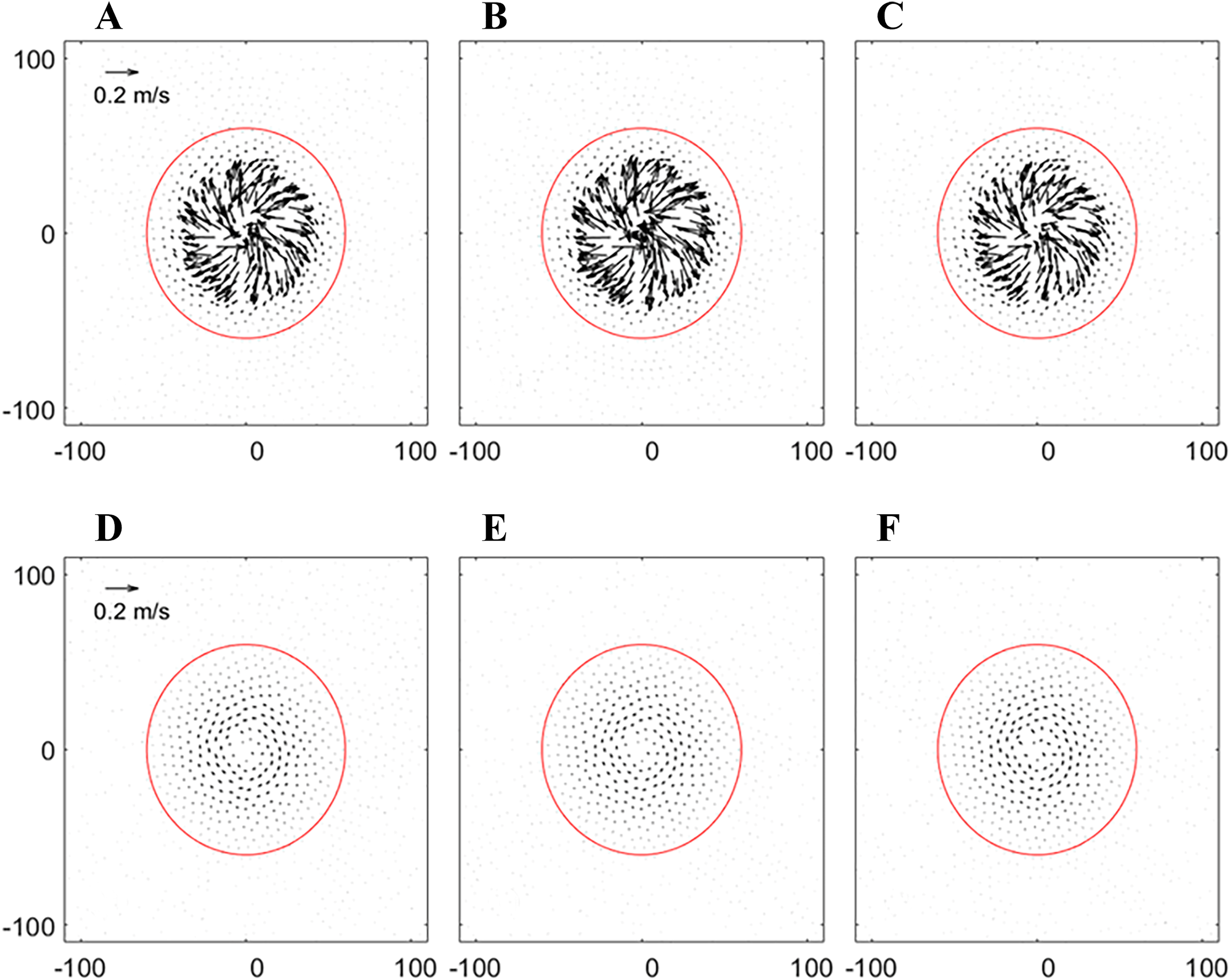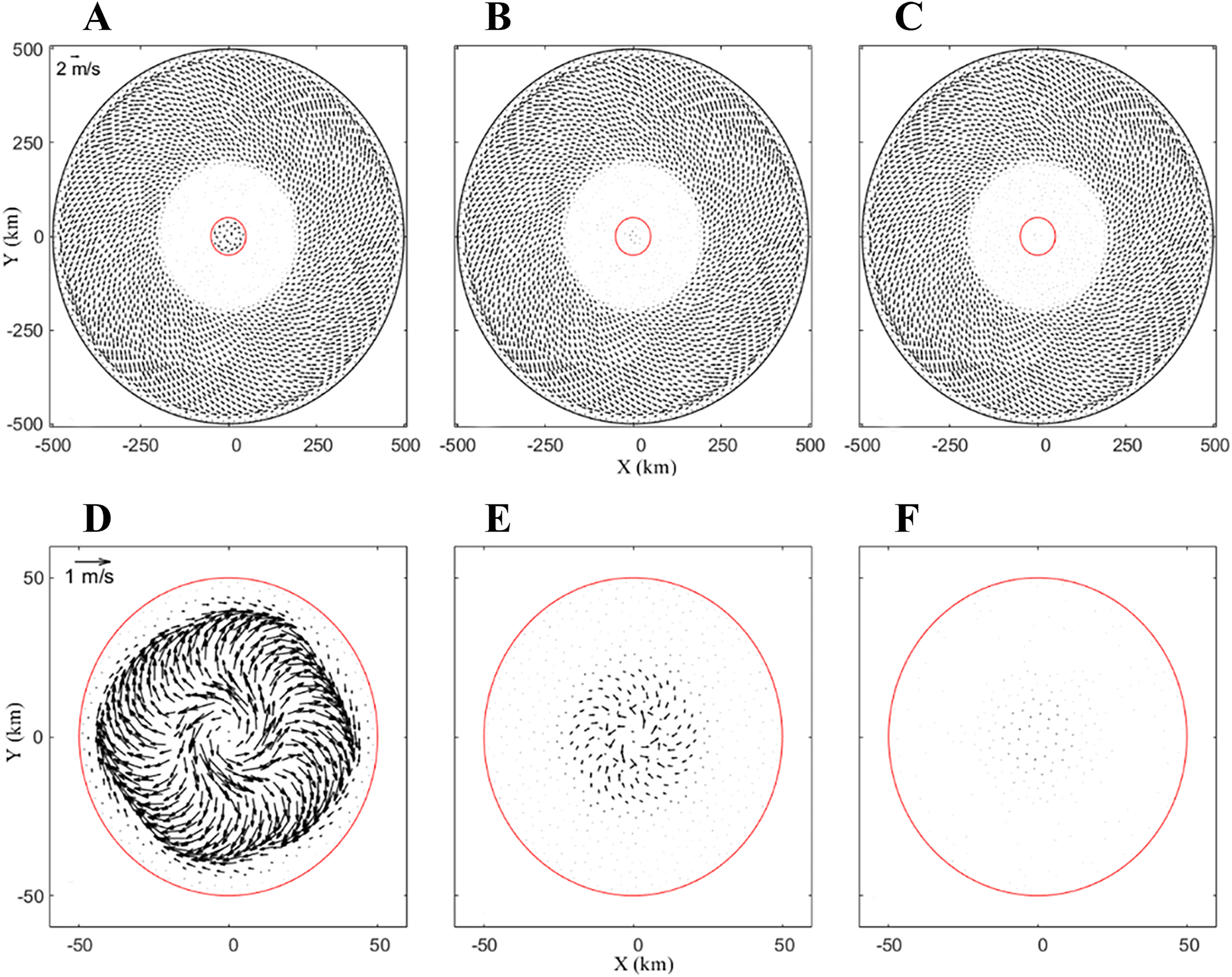 The surface currents on a 32-day run in the experiments of (A) CASEi01, (B) CASEi02, (C) CASEi03, (D) CASEi04, (E) CASEi05, and (F) CASEi06.