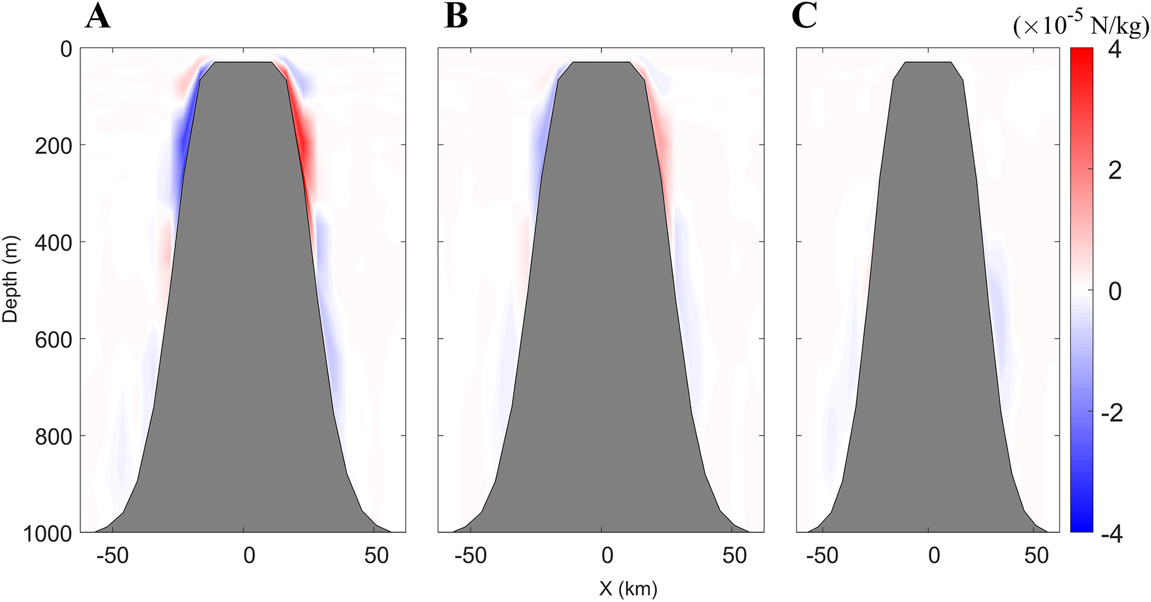 The results of BPG along the east–west transect through the seamount in the experiments of CASEi07 (A), CASEi08 (B) and CASEi09 (C).