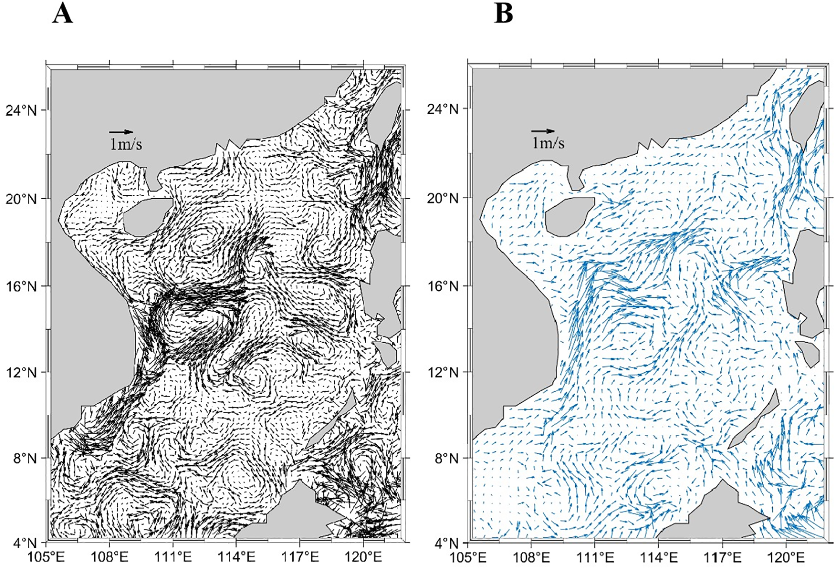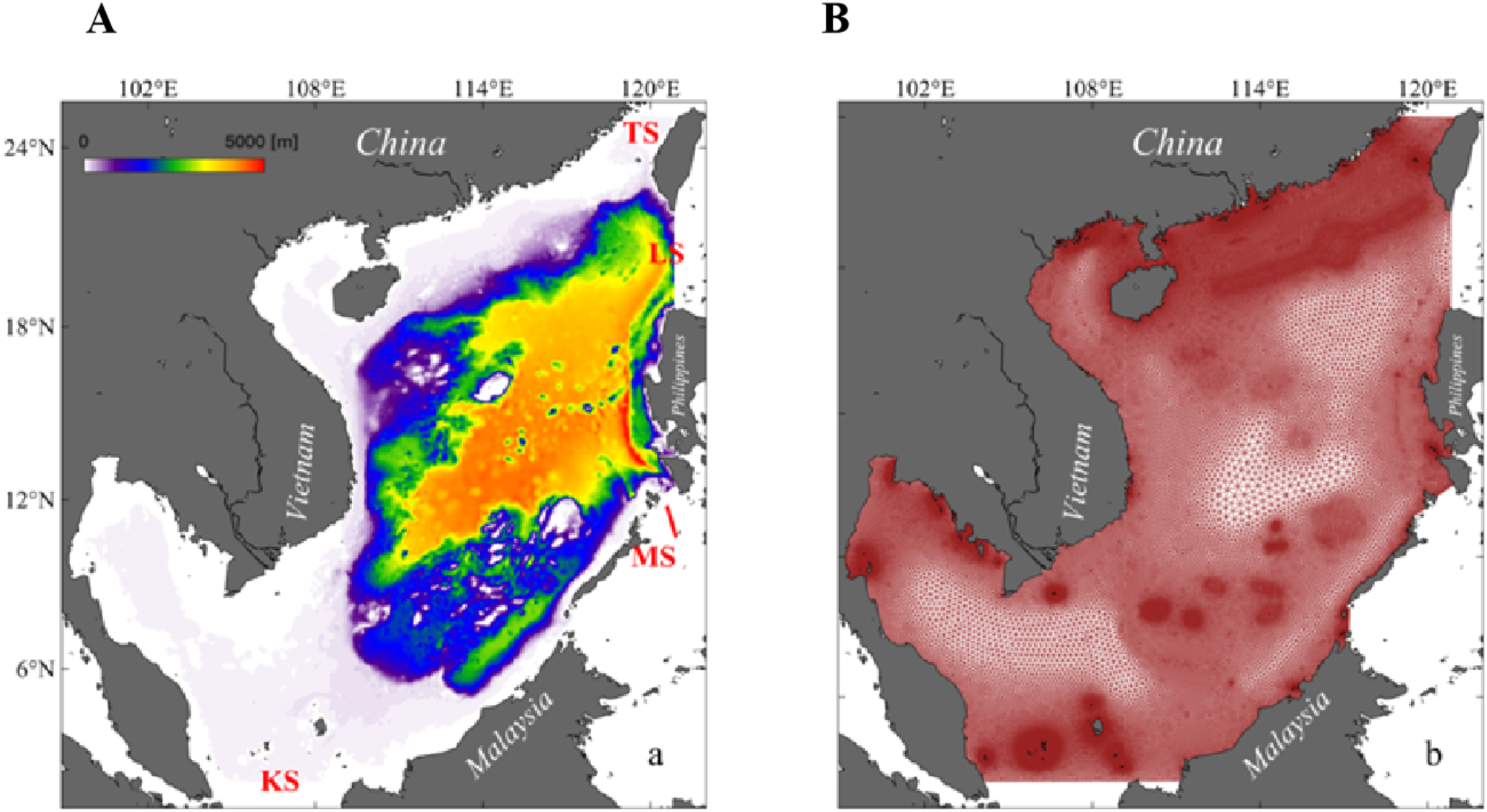 The topography (A) and unstructured grids (B) of the South China Sea.