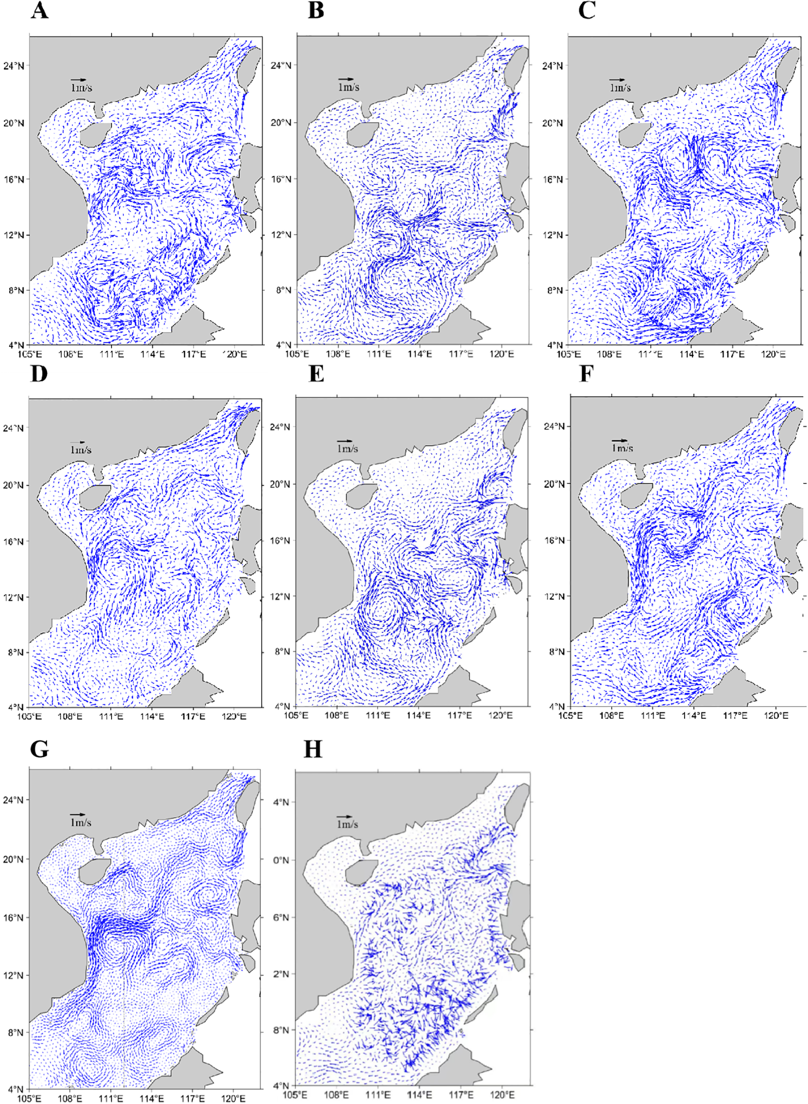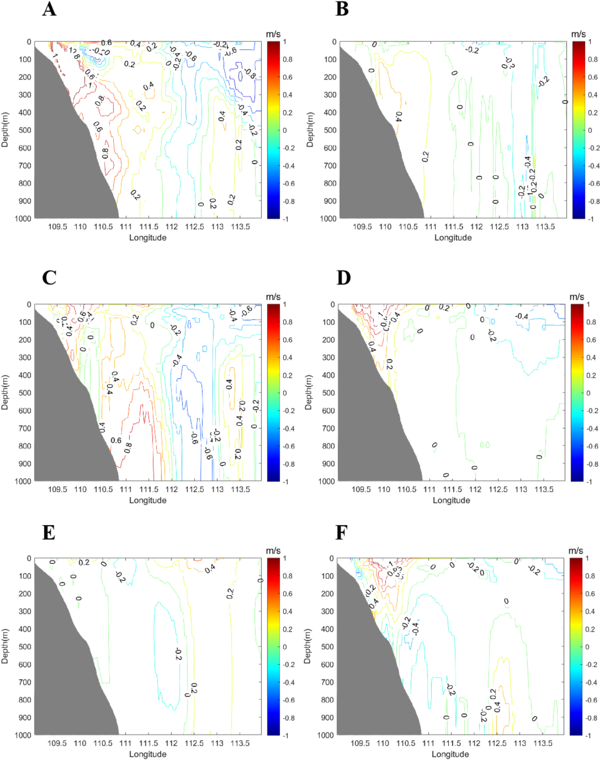 Figure 11A shows the surface geostrophic currents on June 9 derived from AVISO altimeter data, revealing a prominent anticyclonic eddy offshore Vietnam centered near (112°E, 14°N) with a radius exceeding 200 km, alongside smaller vortices in other regions. Figure 11B presents the HYCOM-simulated surface currents, revealing a northward coastal flow along Vietnam and a counterflow to the south near (112°E, 14°N), where a weak cyclonic circulation appears to be nearly established. Figure 12 presents FVCOM-gtsz simulated surface currents from CASEs01–06. Panels 12A–C correspond to simulations using the A1–A3 coordinate systems: A1 and A2 coordinates show incipient eddy formation trends offshore Vietnam with underdeveloped vortical structures, while A3 fails to reproduce any eddy features. Panels 12D–F depict results from B1–B3 coordinates, all successfully simulating anticyclonic eddies offshore Vietnam. The B1-simulated eddy center aligns closely with the AVISO-observed position (112°E, 14°N), whereas B2 and B3 displace the eddy southward to approximately 11°N. Overall, the B1–B3 configurations outperform A1–A3 in eddy simulations. While B1 achieves optimal accuracy, it still underrepresents smaller vortices evident in the AVISO data (Figure 11A). Figure 13 gives simulated cross-sectional velocity (i.e., v-component) perpendicular to the 14°N transect in the SCS using A1–A3 and B1–B3 coordinate systems. The B1 coordinate system effectively simulates the mesoscale eddy near (112°E, 14°N); thus, the flow west of 112°E in Figure 13D is predominantly northward (positive v-component), while the flow east of 112°E is mainly southward (negative v-component). The flow velocities across the section simulated by the other five coordinate configurations exhibit marked discrepancies compared to those in Figure 13D. Figure 12G presents the simulated surface currents from CASEs07, which reproduce most of the eddy features observed in Figure 11A. In addition to the strong mesoscale eddy offshore Vietnam, coherent vortices are simulated near (110°E, 5°N), (114°E, 7°N), (109°E, 9°N), (116°E, 12°N), (115°E, 14°N), (119°E, 15°N), (116°E, 18°N), and (119°E, 21°N). However, significant discrepancies in both eddy positions and rotational directions exist between Figure 12G and Figure 11A in China’s coastal waters. The geostrophic currents in Figure 11A, derived from satellite altimetry, may not adequately represent eddy structures in shallow coastal regions where wind-driven currents dominate and actual flow fields deviate substantially from geostrophic balance. In contrast, Figure 12G depicts flow fields incorporating combined effects of surface winds, sea surface height, and thermohaline processes, resulting in fundamentally different dynamics.