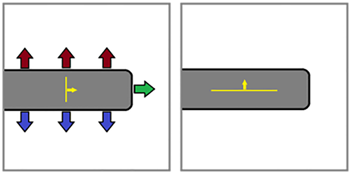 Testing with various 3D models revealed occasional instances of unreasonably high rugosity values, due to a variety of edge-cases where reference planes determined by average surface normal were a poor fit for projecting the triangles in a voxel. An example edge case is shown in Figure 2, where a voxel contains part of an object with large horizontal surfaces connected by a small vertical edge. In calculating the average surface normal, the upward and downward normals cancel each other out, causing the reference plane to be based on the sideways normals of the relatively small edge surface. Thus, the largest surfaces are projected almost perpendicularly, resulting in exceedingly-high rugosity values that do not accurately represent the roughness of the surfaces in the voxel.