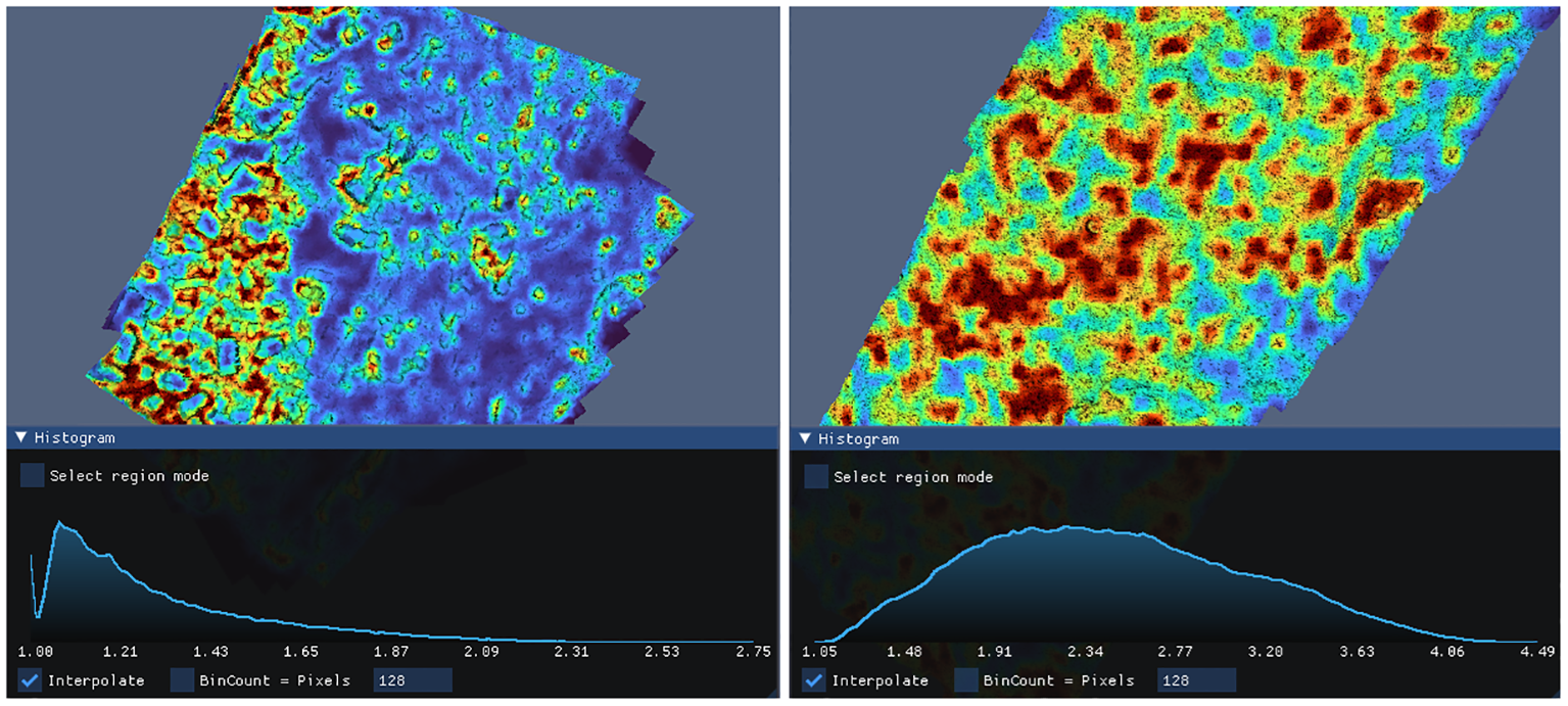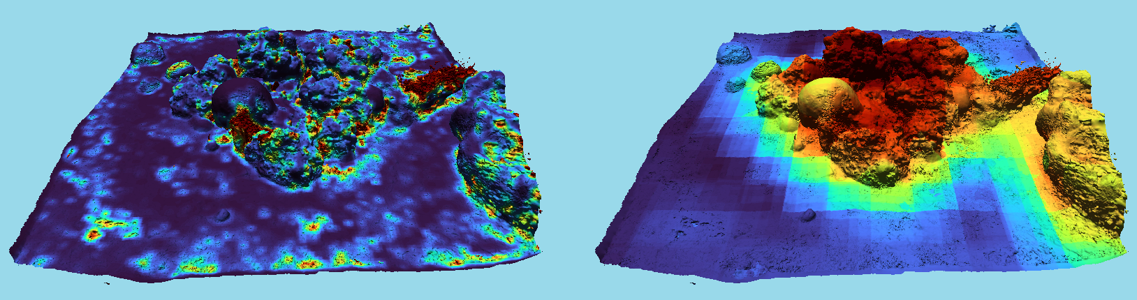 Rugosity heatmaps, showing the blocky results of a single analysis run (left) and the smoother results obtained with multiple analysis runs on jittered grids (right).