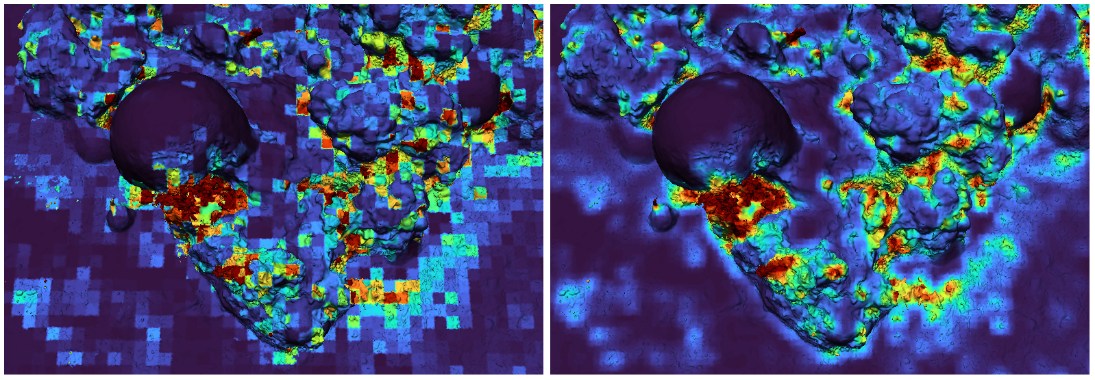 Rugosity maps for the same model, calculated using small (left) and large (right) voxels.