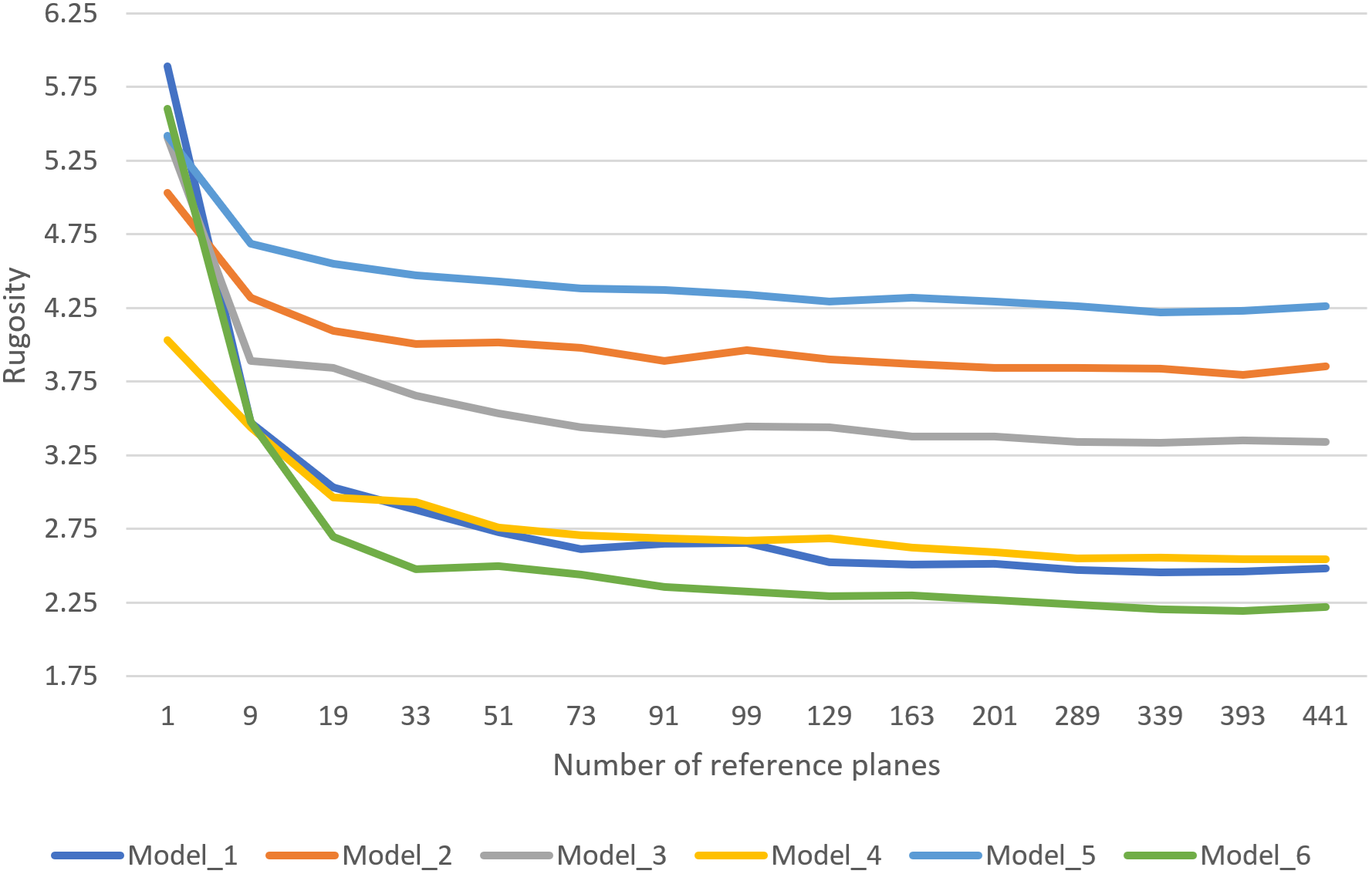 Figure 7 shows the results of testing the minimizing function with different settings on a variety of coral models (some made by Pierce, 2020). A significant, steep drop in rugosity values can be seen between using a single reference plane (average normal) and minimizing using just nine reference planes, indicating the minimizing technique effectively suppresses extreme values resulting from poorly-fit reference planes (see Section 2.1.1). Testing additional reference planes showed diminishing returns, with rugosity values largely stabilizing beyond ~91 planes (our default recommended setting).