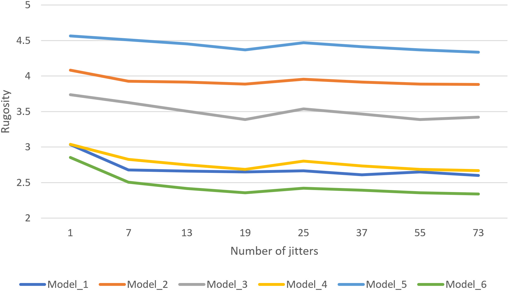 Similarly, we evaluated the number of jitters required to suppress poor results and produce smooth results. For various coral models, rugosity was calculated using a range of jitters, from 1 (no jittering) to 73 jitters. Figure 8 shows the resulting average rugosity values, revealing that only a few (7) jitters are required to effectively suppress unreasonably high rugosity values from problematic grid cell placement. However, to produce smoother results, a much higher number of jitters is required (we recommend 55). Figure 9 illustrates the visual quality obtained by increasing number of jitters. Models that were used to create graphs can be downloaded from: https://ccom.unh.edu/vislab/downloads/RugosityModels.zip