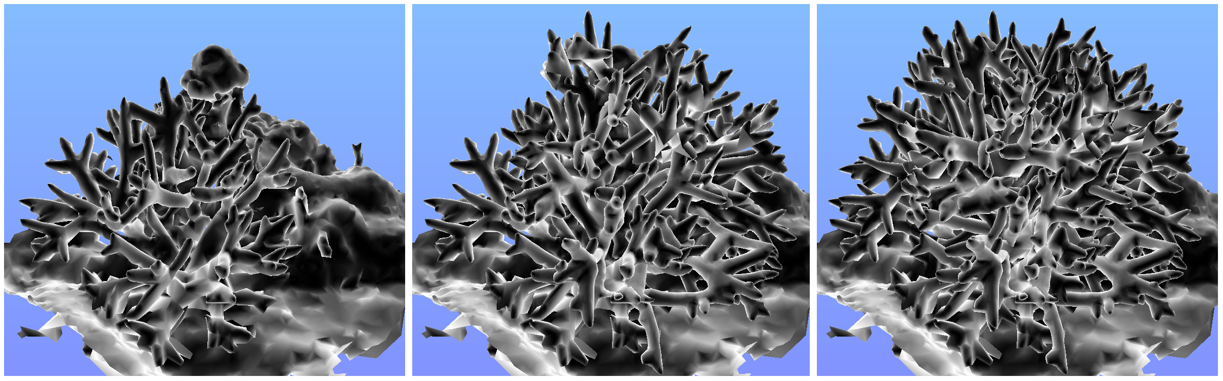Three test models are shown in Figure 12. The first is a snippet of a larger reef model, containing a staghorn coral and seafloor. The second is the same model, with the coral cloned twice (and rotated) to create a larger, denser coral (3x branches). The third model has the coral cloned four times (5x branches), creating an extremely dense coral with complex internal detail.