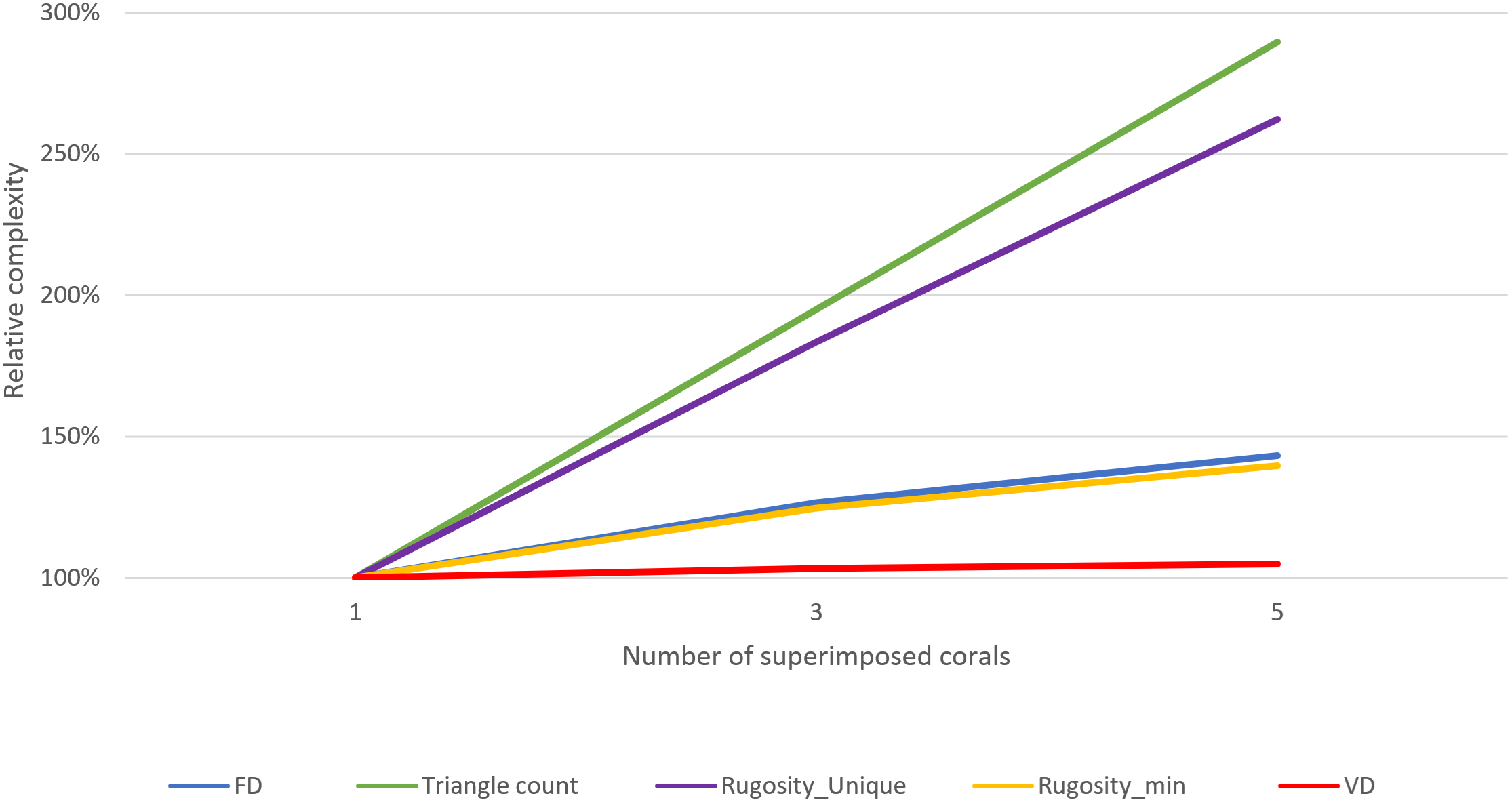 Figure 13 shows the results of each complexity metric calculated on each model as a whole, mirroring how such analysis is often done on single corals. Rugosity, calculated using minimizing and “unique projected area” (slow, but recommended for models with many overlapping features), exhibited the highest correlation with the linearly increasing model complexity (number of superimposed corals). Rugosity, calculated using the (much faster) non-unique minimizing technique did not increase at the same linear rate, but still adequately captured the increasing complexity.
