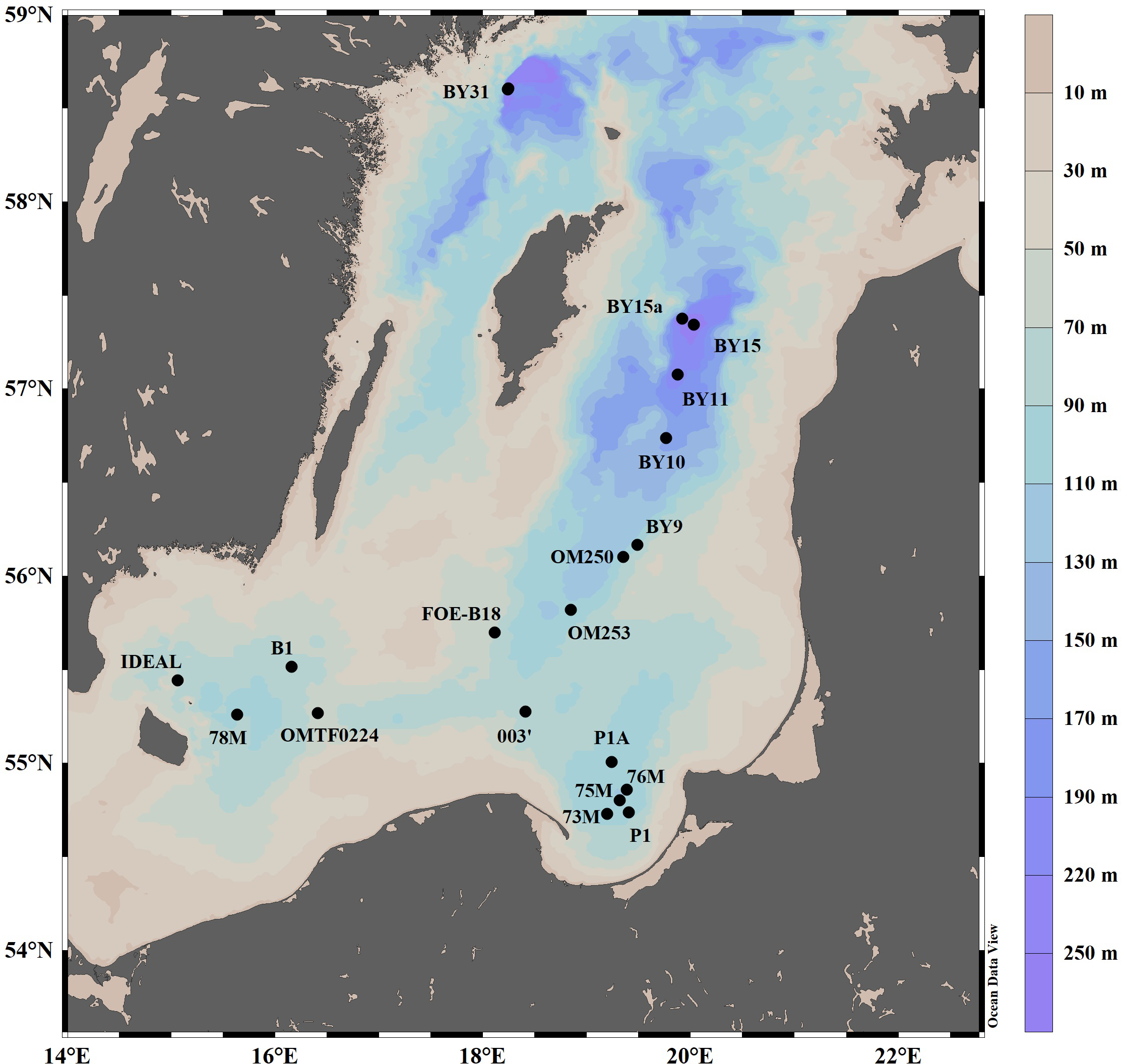 In short, the distribution of N2 in the ocean is controlled by (i) a complex interplay of physical factors such as wind, temperature, and salinity that affect its gas exchange with the atmosphere, and (ii) microbiological processes, such as N2 fixation, denitrification and anammox, which are influenced by the availability of organic matter, nitrogenous nutrients (NO3-, NO2-, and NH4+), and O2. To distinguish between physical and microbial processes (such as denitrification and anammox), the distribution of N2 concentrations can be compared with the distribution of an inert gas, such as Ar, that is only affected by physical processes (Kana et al., 1994; Schmale et al., 2019). The applicability of the N2/Ar ratios to estimate bioavailable nitrogen loss via denitrification and anammox is particularly promising for stratified water bodies such as the Baltic Sea, where hypoxic and anoxic deep waters are separated from the surface water layer with permanent halocline, which is influenced by gas exchange with the atmosphere (Devol et al., 2006; Chang et al., 2010, 2012; Löffler et al., 2011; Hamme and Emerson, 2013; Shigemitsu et al., 2016; Seltzer et al., 2023). Therefore, usage of the N2/Ar method below halocline enables the investigation of spatial and seasonal excess N2 (cumulative effect) rather than the direct calculation of rates of specific microbial processes. Despite this limitation of not providing direct process rates, the N2/Ar method remains a valuable tool for assessing the marine inorganic nitrogen loss in stratified water bodies. In this study, we focus on the net accumulation of N2 in the layers below the halocline and bottom waters. This approach is appropriate, as these layers provide the environmental conditions and substrate availability necessary for nitrogen loss processes to occur. To this end, this study aimed (i) to quantify the cumulative effect of bioavailable N loss via denitrification and anammox expressed as excess dinitrogen gas (N2) in the Baltic Proper and (ii) to decipher the seasonal and spatial variability of excess N2.