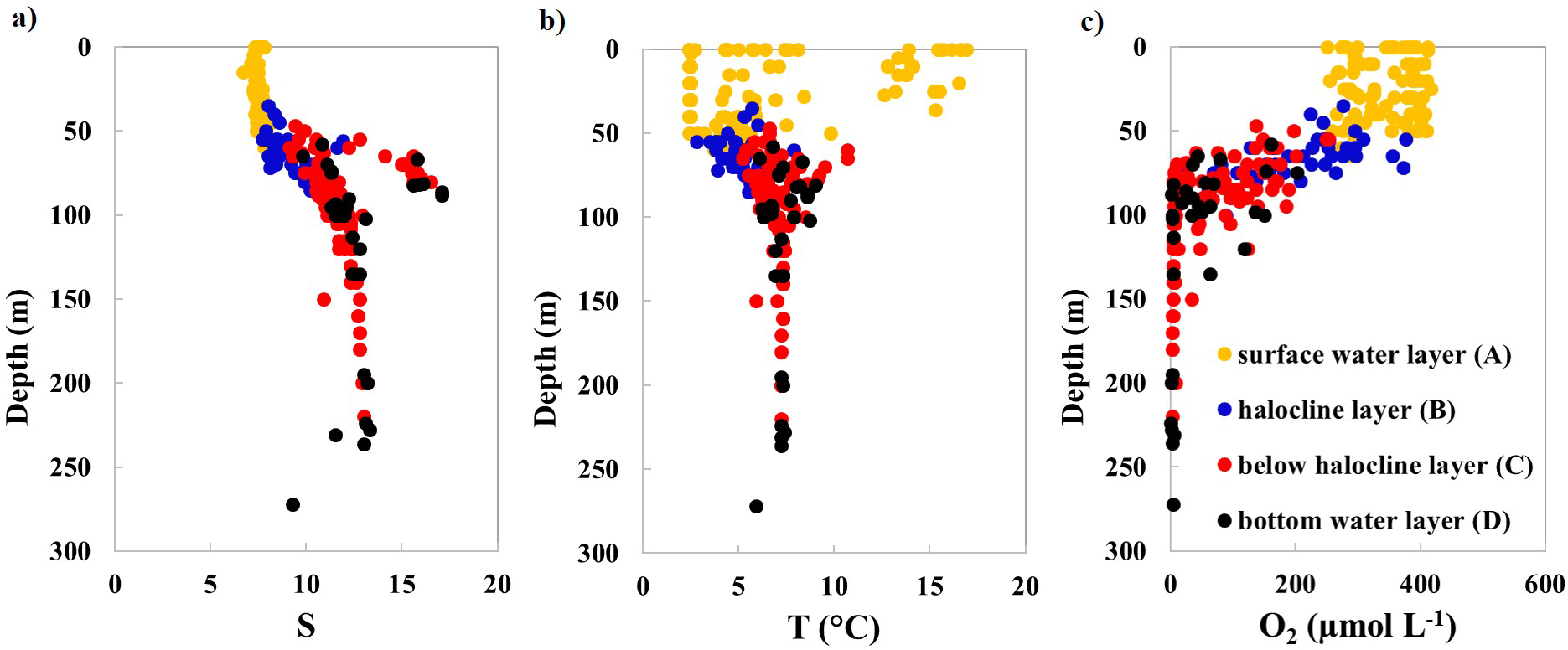 Vertical distribution of measured parameters: (A) salinity (S), (B) temperature (T), and (C) dissolved oxygen (O2) concentrations in the water column of the study area. Yellow dots represent the surface water layer (A); blue dots indicate the halocline layer (B); red dots signify below halocline layer (C); black dots designate bottom water layer (up to 5 m above the seafloor) (D).