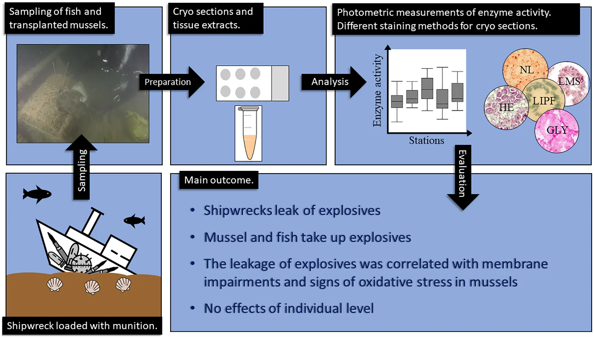 TNT and its metabolites are suspected to cause oxidative stress in cells and tissues of exposed organisms (Adomako-Bonsu et al., 2024). In addition, pre-investigations at the wreck sites revealed low exposure concentrations for dissolved TNT. Therefore, biomarkers were chosen which proved already their response to dissolved TNT in lab studies (Schuster et al., 2021) and are capable to function as early warning markers, showing their effects or endpoints on sub-cellular or cellular levels. Further, preference was given to biomarker which can be applied using both fish and mussels as bioindicators. At the conclusion, for the present study the following biomarkers were selected: Lysosomal membrane stability (LMS), enzyme activity of Catalase (CAT), glutathione S-transferase (GST) and acetylcholinesterase (AChE), as well as the biomarkers lipofuscin (LIPF), neutral lipids (NL) and glycogen (GLY). Further information about the biomarkers is available in the Supplementary Material (chapter S.2).