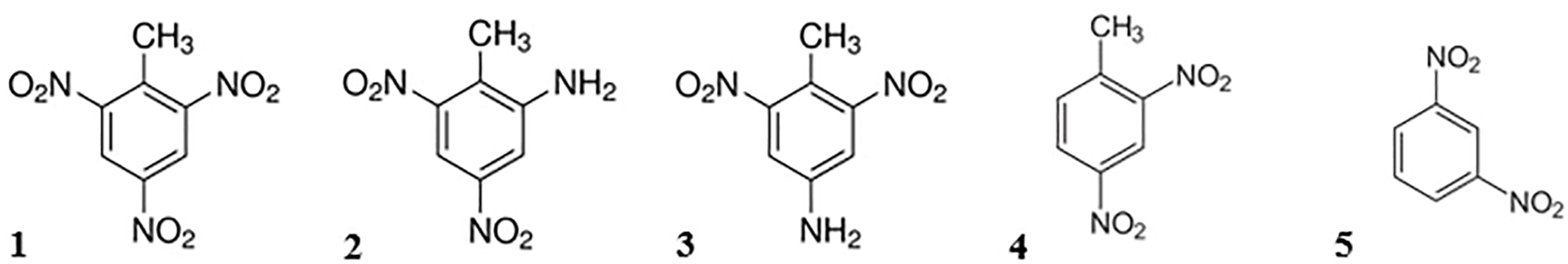 Chemical structure of selected explosives. (1) 2,4,6-trinitrotoluene (TNT), (2) 2-amino-4,6-dinitrotoluene (2-ADNT), (3) 4-amino-2,6-dinitrotoluene (4-ADNT), (4) 2,4-dinitrotoluene (2,4-DNT) and (5) 1,3-dinitrobenzene (1,3-DNB).