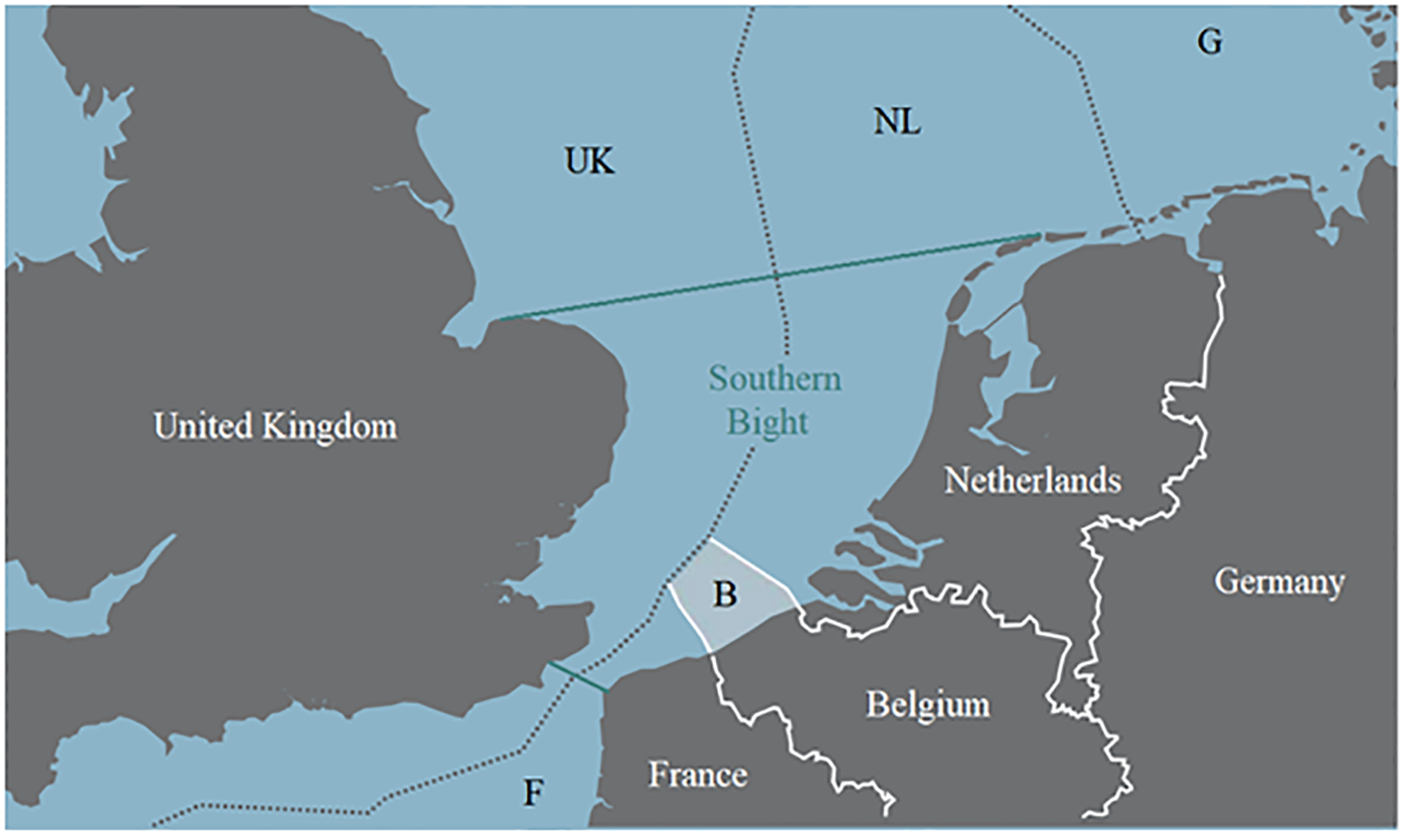 Southern part of the North Sea including the economic zones. The area enclosed by green lines represent the Southern Bight. The white shaded area marked with “B” represents the Belgian economic zone (Maes et al., 2005 modified).