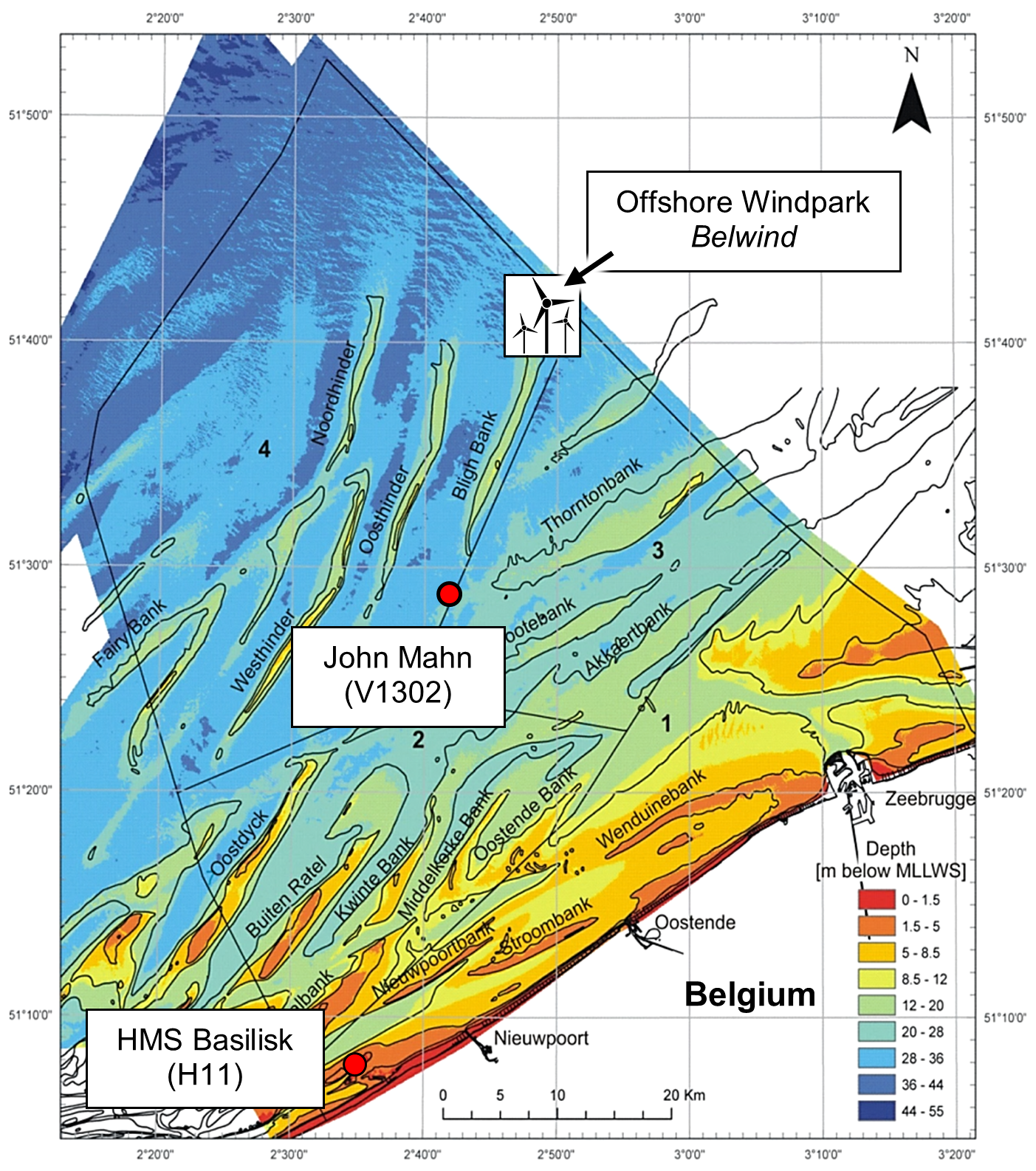 Map of the Belgian coast. Positions of the shipwrecks John Mahn/V1302 and HMS Basilisk are indicated by red dots. The wind park reference area Belwind is indicated by windmills. The colour code represents depth in m below mean lower low water spring tides (MLLWS) (Mathys, 2009 modified).