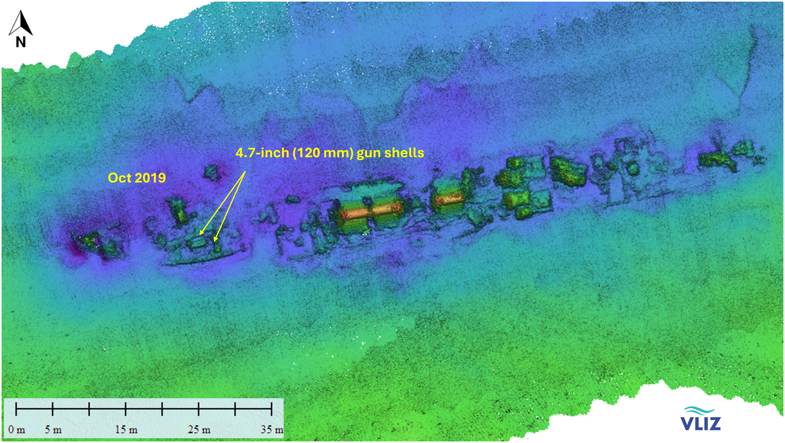Throughout WWII, the world experienced the single, largest loss of shipping in any period of time (Gilbert, 2005). For instance, in the East Asian Pacific alone more than 3,800 vessels were sunk during WWII, and it is likely that many of these ships were still loaded with munitions at the time of sinking (Monfils et al., 2006). Also the North Sea was a so-called watery grave for many ships (Bellamy, 1991). Data from the German Maritime Agency, Hamburg record approx. 120 military shipwrecks (Grassel et al., 2021) from WWI and II within the German Exclusive Economic Zones (EEZ) alone. In the Belgian part of the North Sea (BPNS) there are 140 known and identified wrecks that were sunk during war activities. About one hundred of these shipwrecks may still contain munitions (Deutsches Schifffahrtsmuseum, n.d).