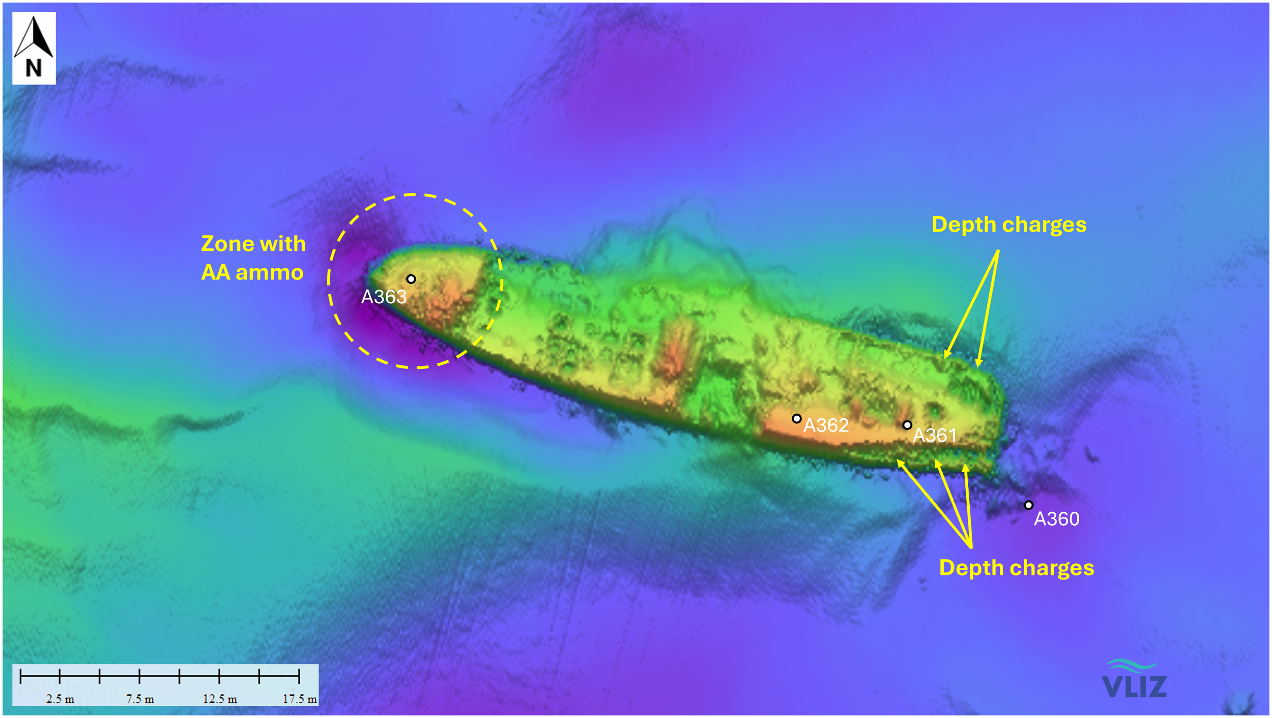 The V1302 lies approx. 37 km northwest of Zeebrugge at 51° 28′ 42″ N; 2° 43′ 18″E (Figure 3) in 35 meter depth (Gröner et al., 1993; Lettens, 2002). The wreck is positioned on its keel with a slight slope to starboard side (25°) in east-west direction (Figure 5). Below the former water line close to the bridge a big hole from one of the bomb impacts is visible. Depth charges can be found on the stern. The wreck is entangled with nets, trawls and fishing lines (Lettens, 2002).