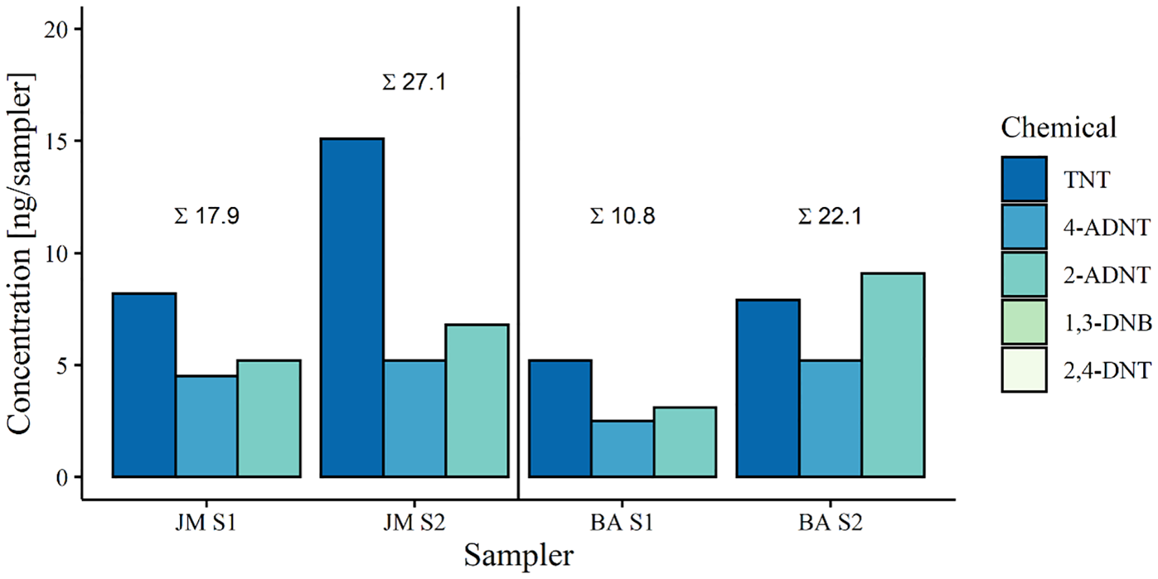 For the cruise in 2019 passive samplers, TNT, 4-ADNT and 2-ADNT were targeted (Figure 6). Results revealed the presence of explosives at both the V1302/John Mahn (JM) and the HMS Basilisk (BA) in the order of ng per sampler. The passive samplers at V1302 had a higher total concentration of explosives (JM: Average concentration of 22.5 ng/sampler. BA: Average concentration of 16.5 ng/sampler). In general, TNT was found at the highest concentration (JM S1: 8.2 ng/sampler, JM S2: 15.1 ng/sampler, BA S1: 5.2 ng/sampler, BA S2: 7.9 ng/sampler), followed by 2-ADNT (JM S1: 5.2 ng/sampler, JM S2: 6.8 ng/sampler, BA S1: 3.1 ng/sampler, BA S2: 9.1 ng/sampler) and 4-ADNT (JM S1: 4.5 ng/sampler, JM S2: 5.2 ng/sampler, BA S1: 2.5 ng/sampler, BA S2: 5.2 ng/sampler).