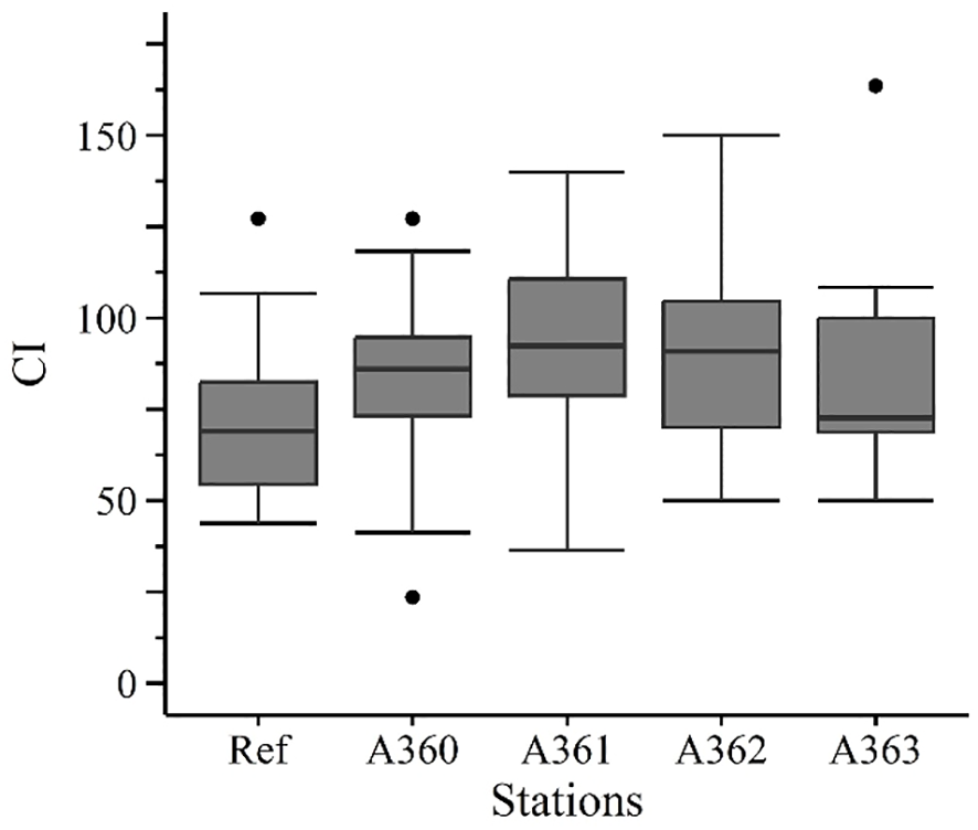 After the exposure phase mussels were collected and directly processed in the wet lab of the research vessel. Shell length was measured using a Vernier calliper (± 0.1 mm). Total wet weight and shell wet weight were determined using a laboratory scale to calculate the condition index (CI) (Equation 1).
