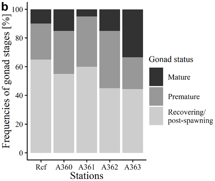Sex and gonadal status were determined using the same light microscope and camera like described earlier at 100-fold magnification. Gonadal status was separated into 3 categories according to Brenner et al. (2014): (1) Recovering (non-discriminable), (2) premature (discriminable) and (3) mature gonads (discriminable). Pictures showing examples of the different categories are given in Supplementary Figure S2 in the supplementary chapter S.3. Numbers of individuals assigned to a specific category were counted and displayed as percentages.