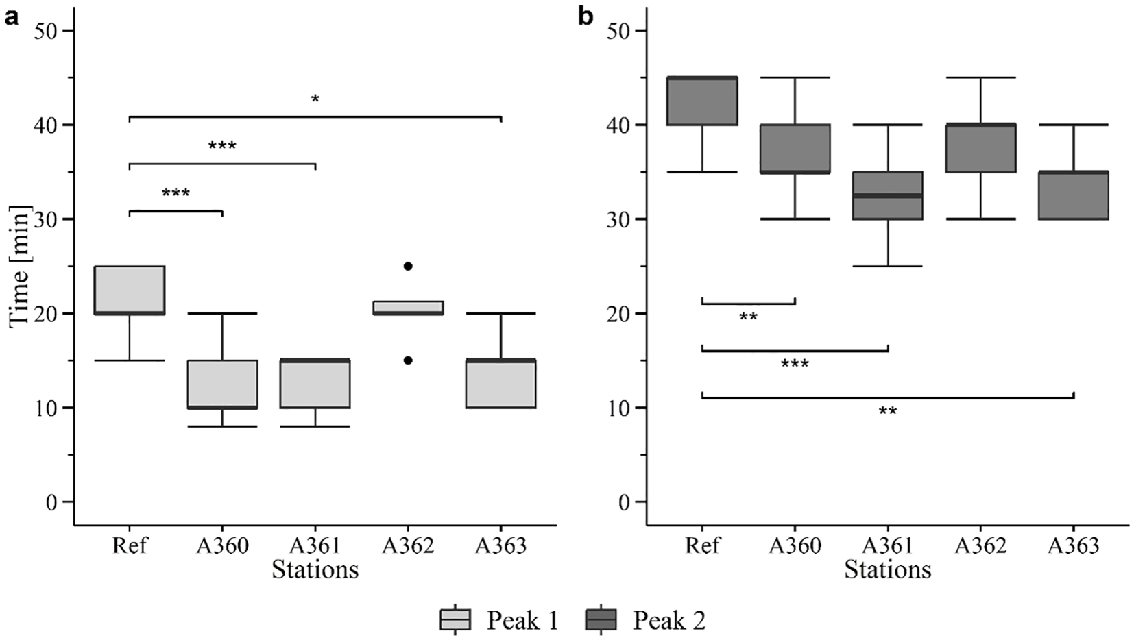 To assess the lysosomal membrane stability the staining intensity of lysosomes was measured. The time needed for destabilisation of the membrane is reflected by the maximal staining intensity in the lysosomes represented by a “peak”. In general two peaks are present which represent different membrane properties of two sub-populations of lysosomes (Moore et al., 2004). The earlier the peaks occur, the more unstable the membrane was which indicates pre-damage. To determine the labilisation period only the first peak is used (Moore et al., 2004).