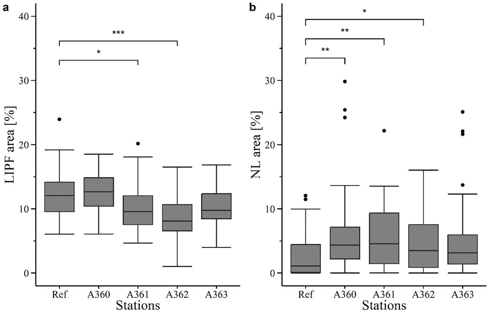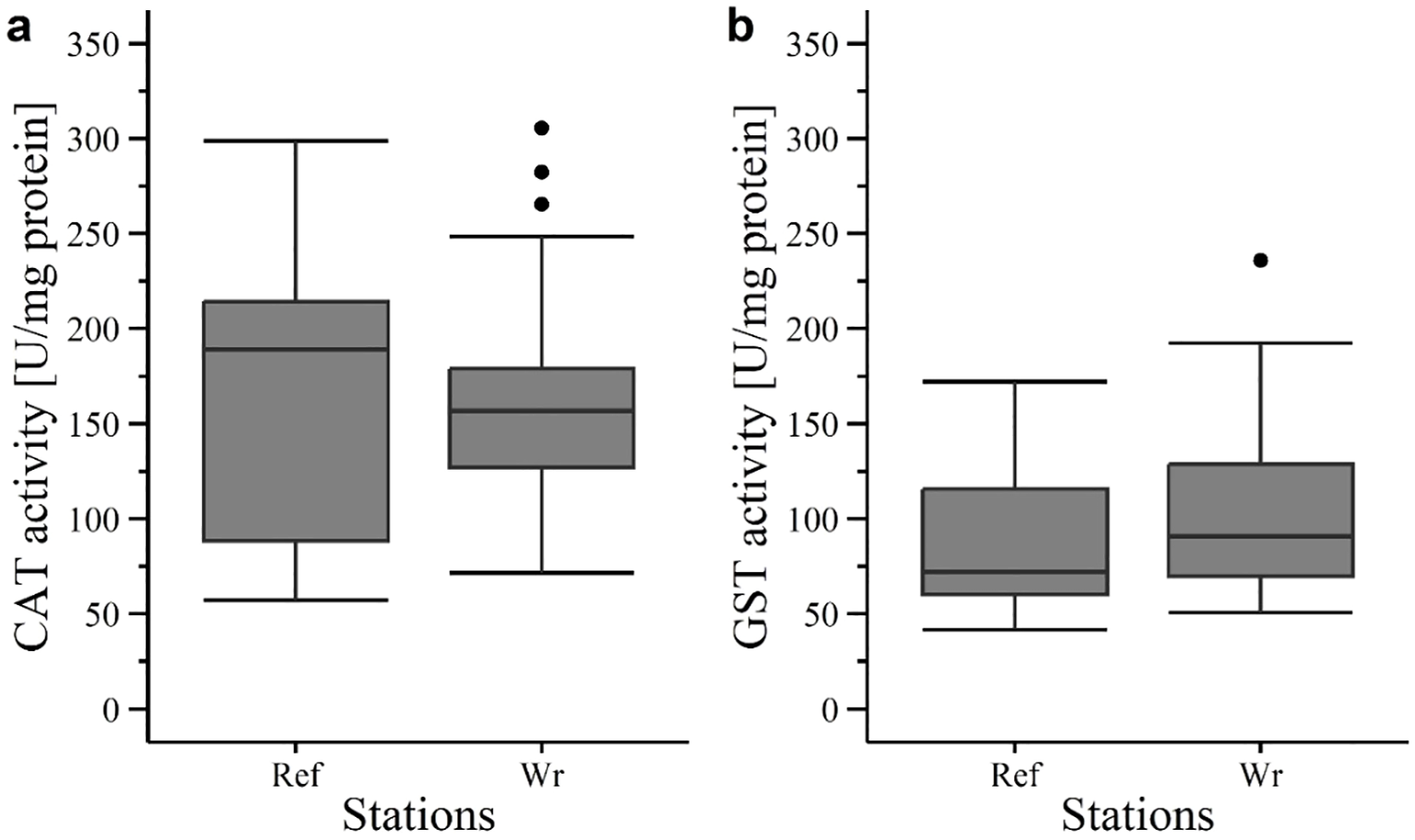 Enzyme activity measurements for catalase (CAT) and glutathioneS-transferase (GST) activity were conducted using 96-well UV microplates. Acetylcholinesterase (AChE) activity was measured by using non-UV 96-well microplates. Measurements were done with a microplate reader (Infinite 200, TECAN) and analysed with i-control software 2.0. The volume of supernatants, reaction buffer and reagents in the wells for photometric measurements were adjusted to the used tissue samples in the present study. Samples were measured directly after homogenisation. Leftover extracts were frozen at -20°C for the determination of total proteins. Enzyme activity was adjusted to protein concentration in samples according to Bradford (1976). Protein analyses were conducted using the same microplate reader and non-UV 96-well microplates.