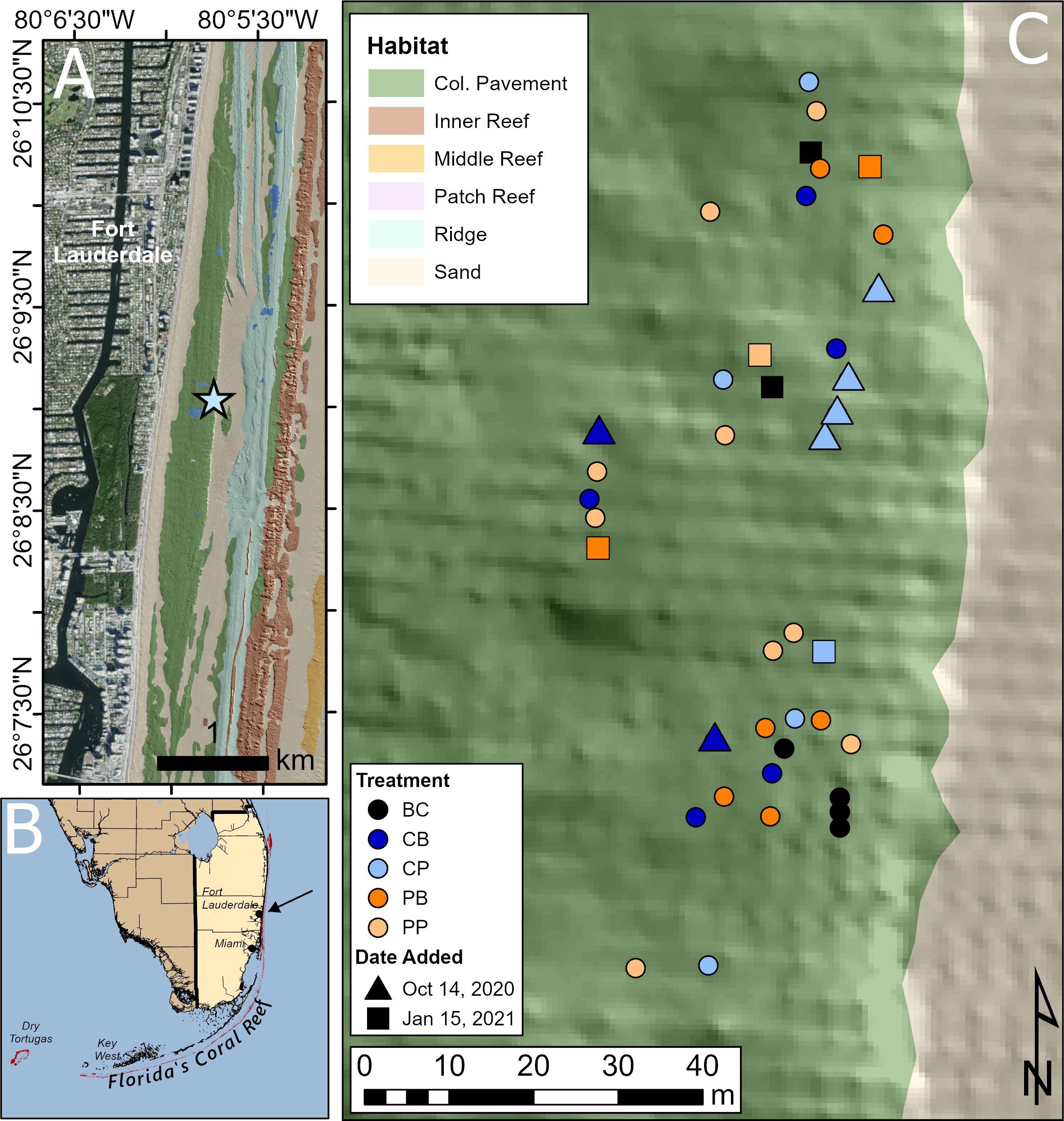 Site map of in situ probiotic applications. (A) The research site (star) off the coast of Fort Lauderdale, Florida with colonized pavement topography explained by Walker et al. (2008). (B) This site (indicated by black arrow) is located off southeast Florida, US. (C) The spatial distribution of Montastraea cavernosa colonies at this site, with different colored circles indicating each treatment. Treatment: BC, background control, black; CB, control bag, dark blue; CP, control paste, light blue; PB, probiotic bag, dark orange; PP, probiotic paste, light orange. Infected coral colonies denoted with a circle were tagged and added to the site at the beginning of experimentation, Sep. 1, 2020. These corals received three treatment applications. Triangles represent newly found diseased corals that were tagged and added to the site on the second treatment date, Oct. 14, 2020. These corals received two of the three total treatment applications. Squares represent newly found diseased corals that were tagged and added to the site on the third treatment date, Jan. 15, 2021. These corals received one of the three treatment applications.