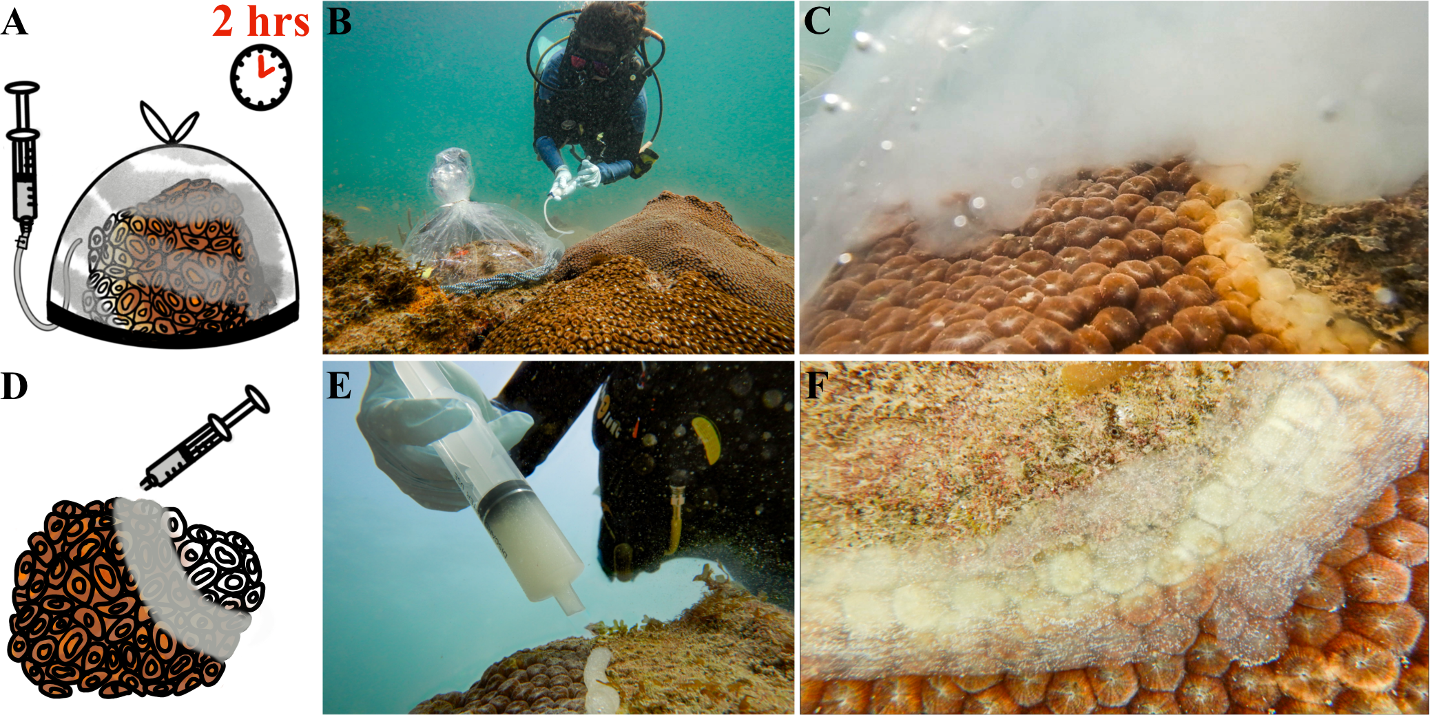 Probiotic treatment of Montastraea cavernosa colonies using two methods, a whole-colony bagging or lesion-specific paste technique. (A) The whole-colony bagging technique involves covering an infected coral with a weighted plastic bag, syringing the probiotic McH1–7 into the bag, and waiting two hours before removing the plastic bag. (B) A diver treating an infected M. cavernosa colony with the whole-colony bagging technique along a coral reef. (C) A cloud of McH1–7 bacteria under the bag, slowly dispersing across the whole coral colony. (D) The lesion-specific paste treatment with McH1–7 involves syringing a sodium alginate-based paste over the active lesion and smoothing it down across apparently infected tissue along the lesion. (E) A diver applying the paste to a diseased colony along the reef. (F) The paste is then smoothed flat with a gloved hand across the active lesion.